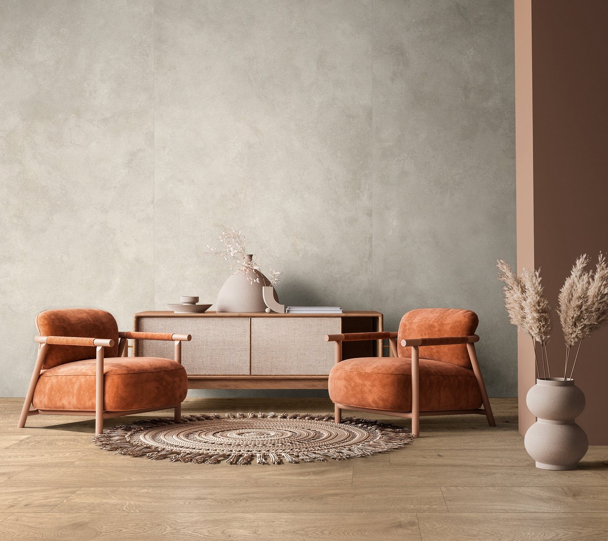 La collezione Stratford Wall si distingue per un’estetica ispirata all’effetto cemento, una scelta sempre più apprezzata nel design moderno per la sua capacità di unire stile industriale e raffinatezza.