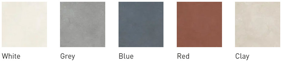 La collezione si sviluppa in cinque tonalità principali: White, Grey, Clay, Red e Blue. Queste varianti cromatiche consentono di giocare con contrasti o creare ambienti più armoniosi e rilassanti.
