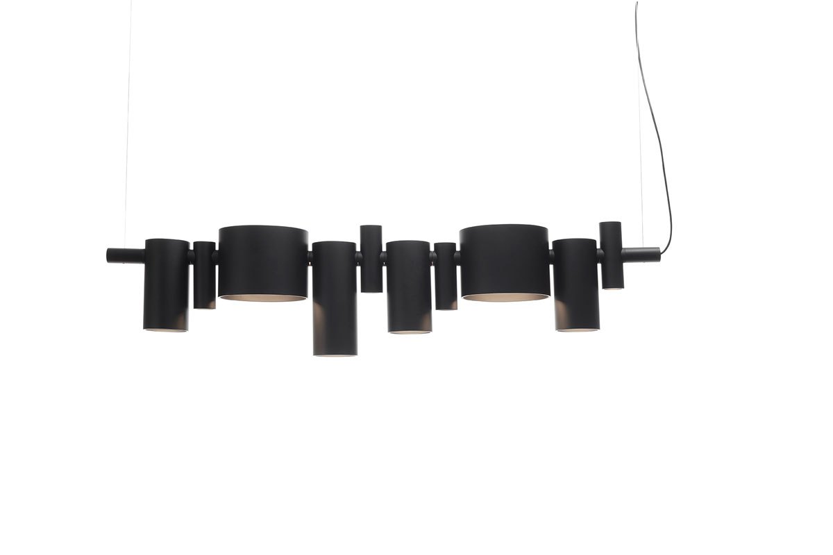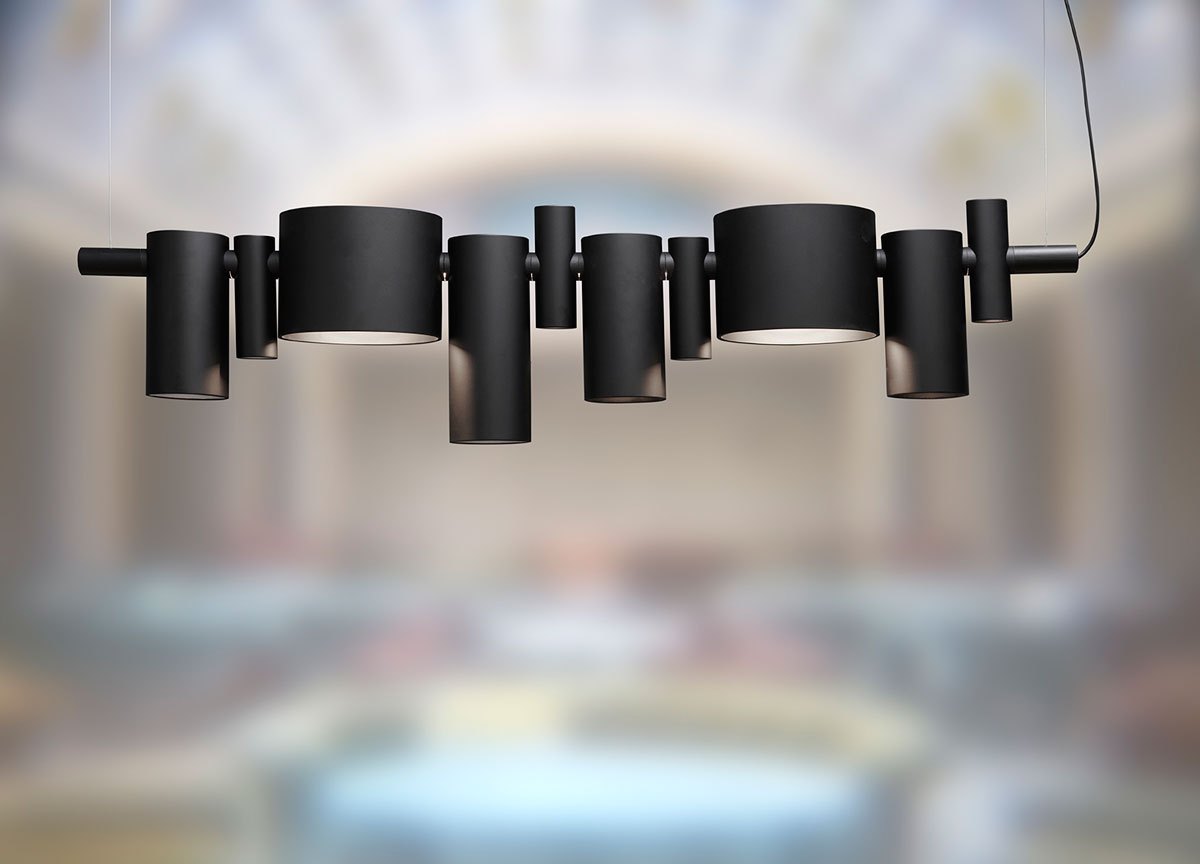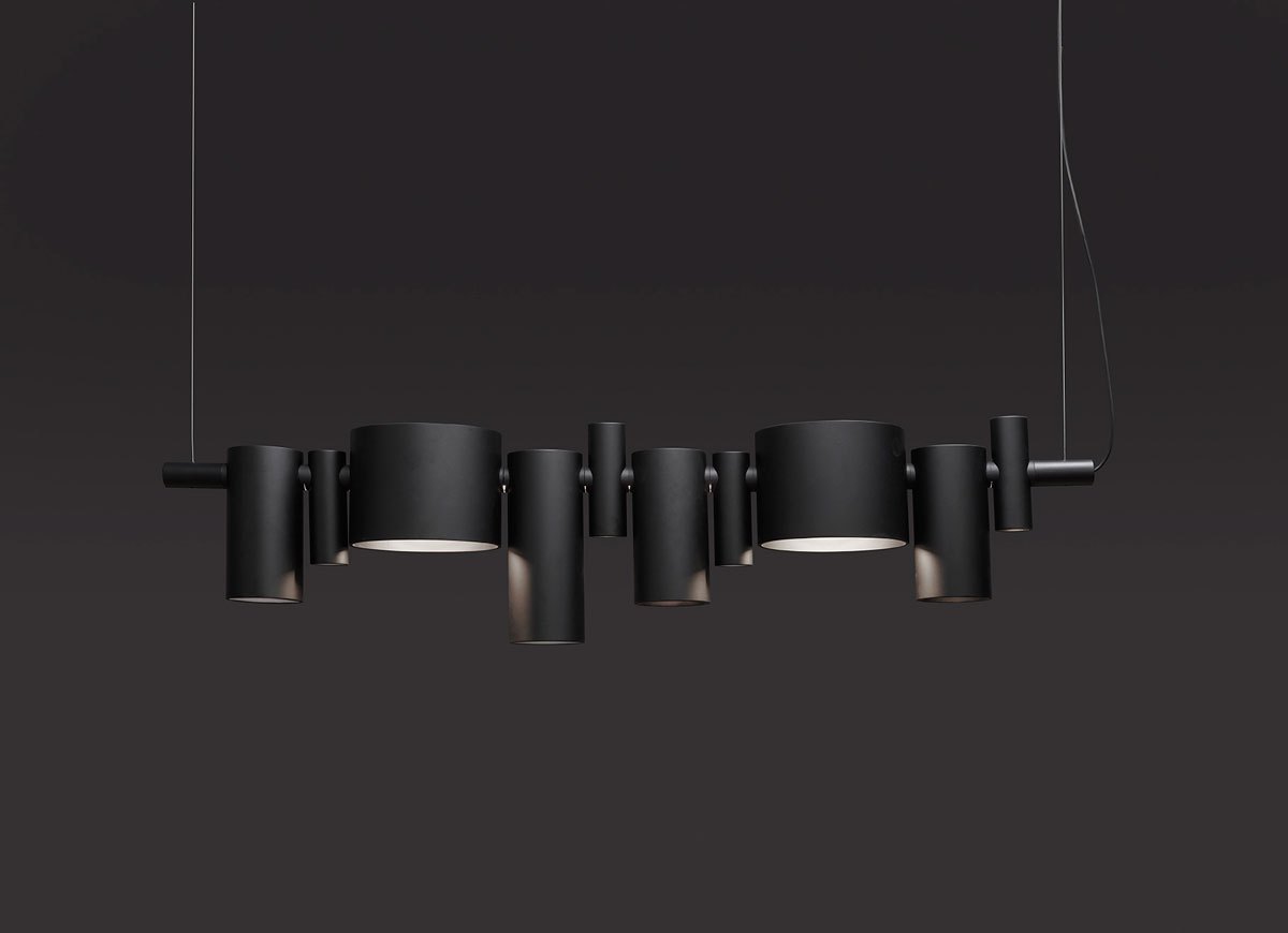 In questa lampada, gli spot, solitamente considerati elementi tecnici, diventano decorativi grazie al loro design irregolare sia nelle dimensioni che nel posizionamento lungo il supporto centrale. Dancing Queen sembra una scultura sospesa, dove gli spot possono essere disposti secondo uno schema ritmico, come nelle composizioni musicali, per creare suggestive armonie di illuminazione. Disponibile in due varianti cromatiche: nero opaco e grigio lucido.