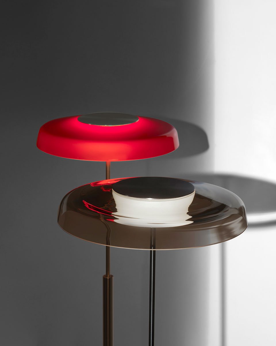 I suoi dischi, sostenuti da un sottile stelo tubolare, possono ruotare di 360°, permettendo di orientare la luce dove si desidera. Le finiture déco disponibili per i dischi sono in ottone anodizzato o nero opaco, offrendo due soluzioni stilistiche distintive.