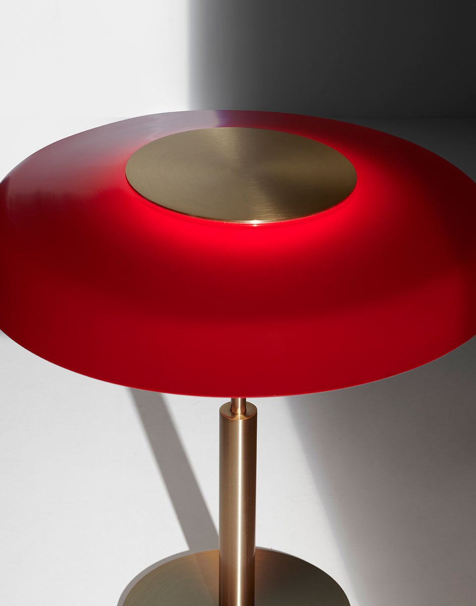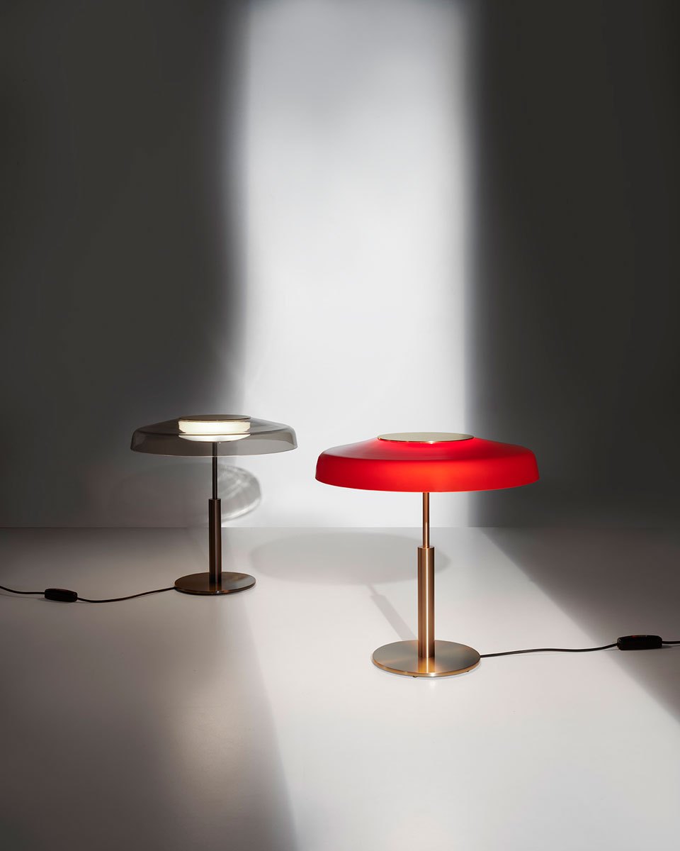 Una presenza luminosa delicata dal fascino antico, con richiami evidenti alle forme classiche, attenuati e resi contemporanei nella semplicità dello stelo e della base in metallo. Dora è disponibile nelle versioni da tavolo e da terra, in due eleganti finiture: una con corpo in oro satinato e paralume rosso, che richiama un’estetica decisamente rétro, e l’altra con corpo in nickel satinato e paralume fumé, per un look più moderno e austero.