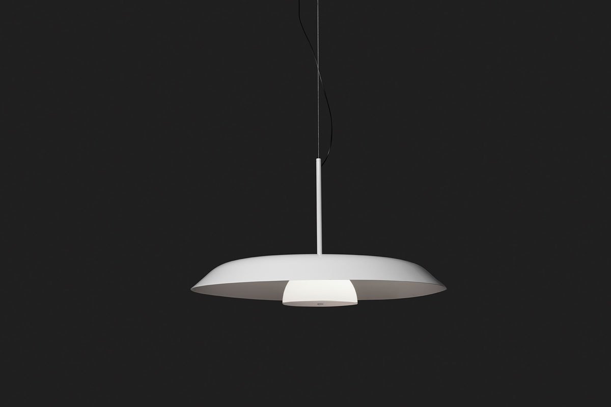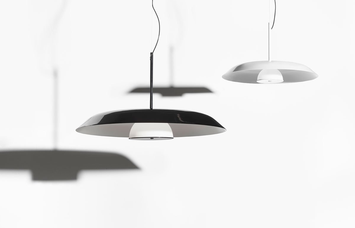 Il diffusore centrale in vetro opalino aggiunge carattere alla lampada, formando una goccia stilizzata al centro della cupola minimalista. La luce emessa da Iride si diffonde delicatamente grazie alla riflessione del paralume, rendendola perfetta per gli spazi domestici. La collezione è disponibile in versione total white oppure con l’interno bianco e l’esterno nero o rosso lucido.