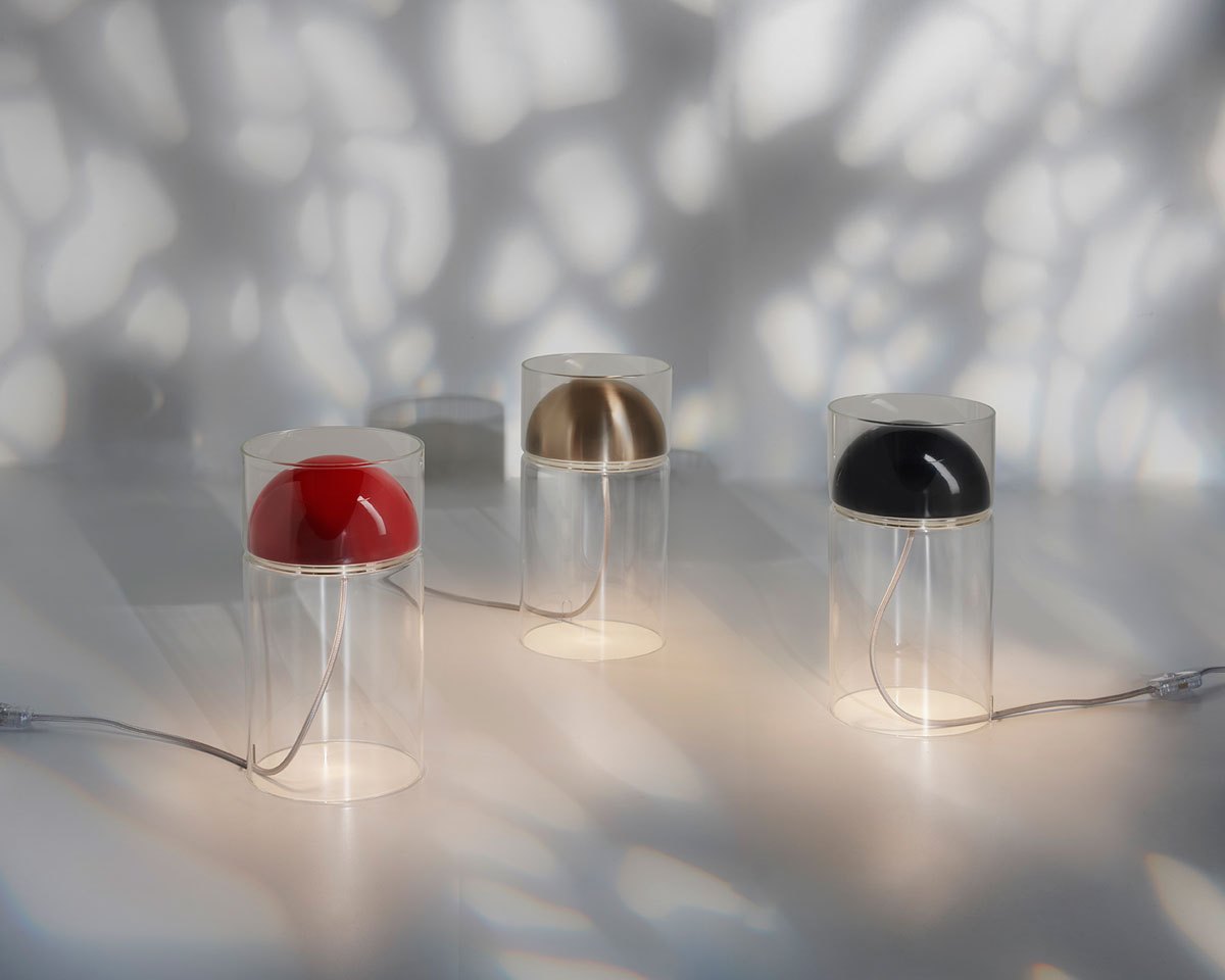 In Medusa, il rapporto tradizionale tra base e paralume è capovolto: la base non sostiene il paralume, ma lo ingloba. La cupoletta luminosa resta sospesa all’interno del cilindro grazie a una raffinata piega del vetro. Il cavo elettrico, che scende liberamente dal centro del diffusore, crea suggestivi riflessi ondulati, aggiungendo un tocco di leggerezza al design complessivo. La lampada è disponibile in tre varianti cromatiche: nero lucido, oro satinato e rosso scarlatto.