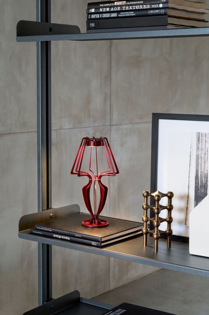 Disponibili in sei colori eclettici: Grafite, Champagne, Bronzo, Rubino, Oliva e Ottanio, le varianti da appoggio e a piantana includono una piastra LED ricaricabile tramite USB. Il dispositivo calamitato consente una facile movimentazione, ideale anche per l’uso all’aperto.