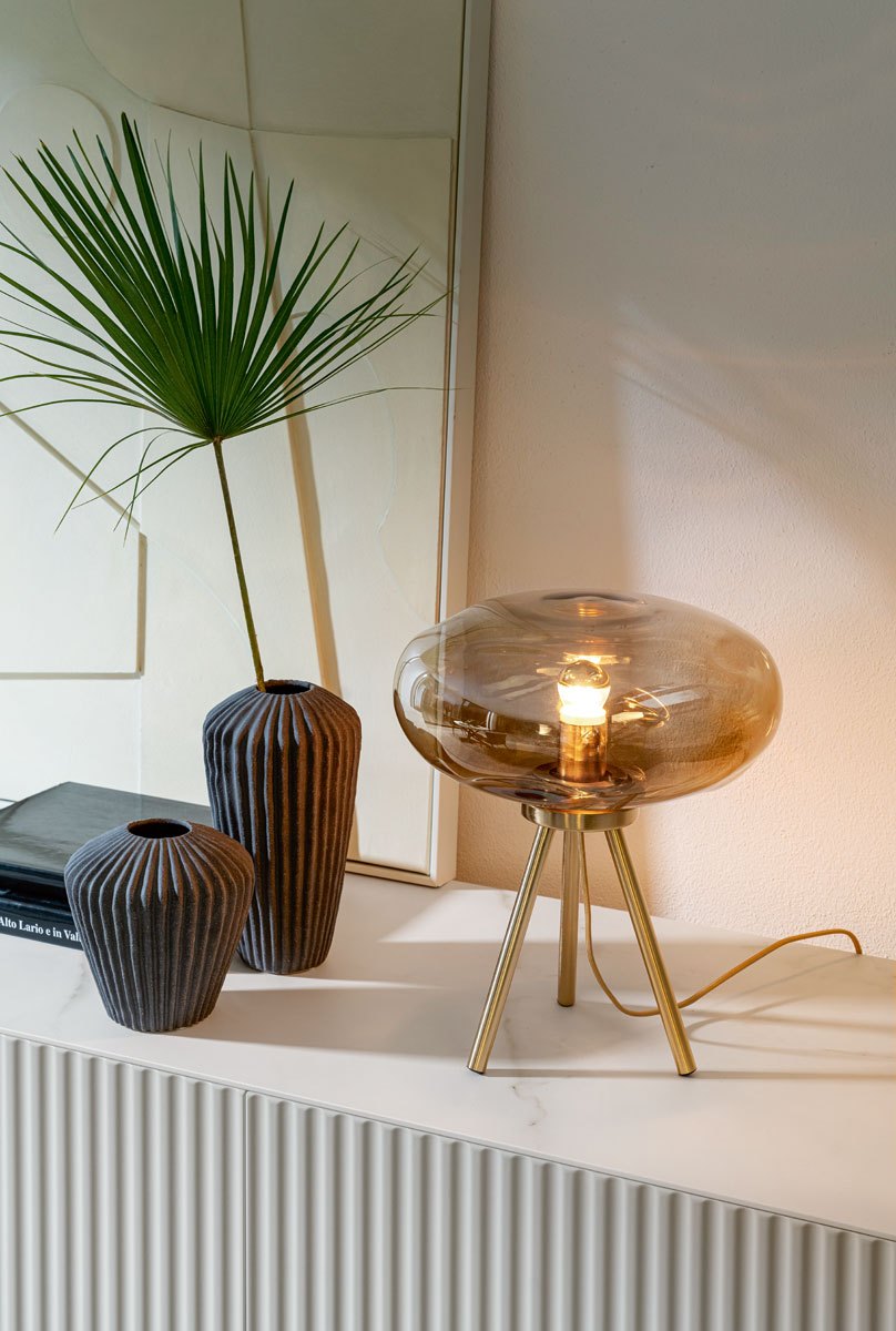 Le nuove lampade di Riflessi si vestono di finiture preziose e materiali naturali, come il vetro, sapientemente lavorato da esperti artigiani, nel solco della tradizione italiana ma affiancata a una costante ricerca di innovazione.