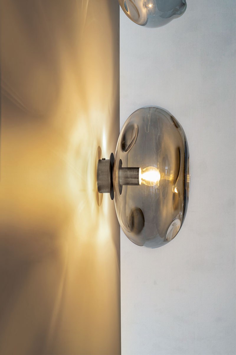 Si presenta con un corpo quasi impalpabile che evoca le forme morbide delle bolle di sapone, in grado di donare all’ambiente un’atmosfera onirica e rilassante. Nubola nasce dalle mani di abili artigiani che modellando il vetro fuso tramite una canna da soffio, danno vita a paralumi in vetro pyrex, disponibili nelle varianti fumé o tabacco.