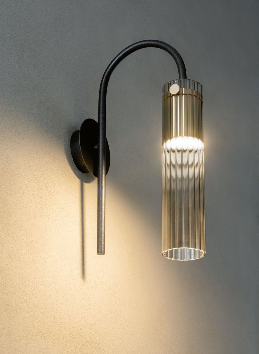 Il nome Tube deriva dal modulo tubolare in vetro pyrex cannettato, che ospita le sorgenti luminose previste nelle varianti trasparente, fumé o color tabacco. Disponibile come applique, sospensione verticale (singola o a sei elementi) o composizione orizzontale a tre elementi.