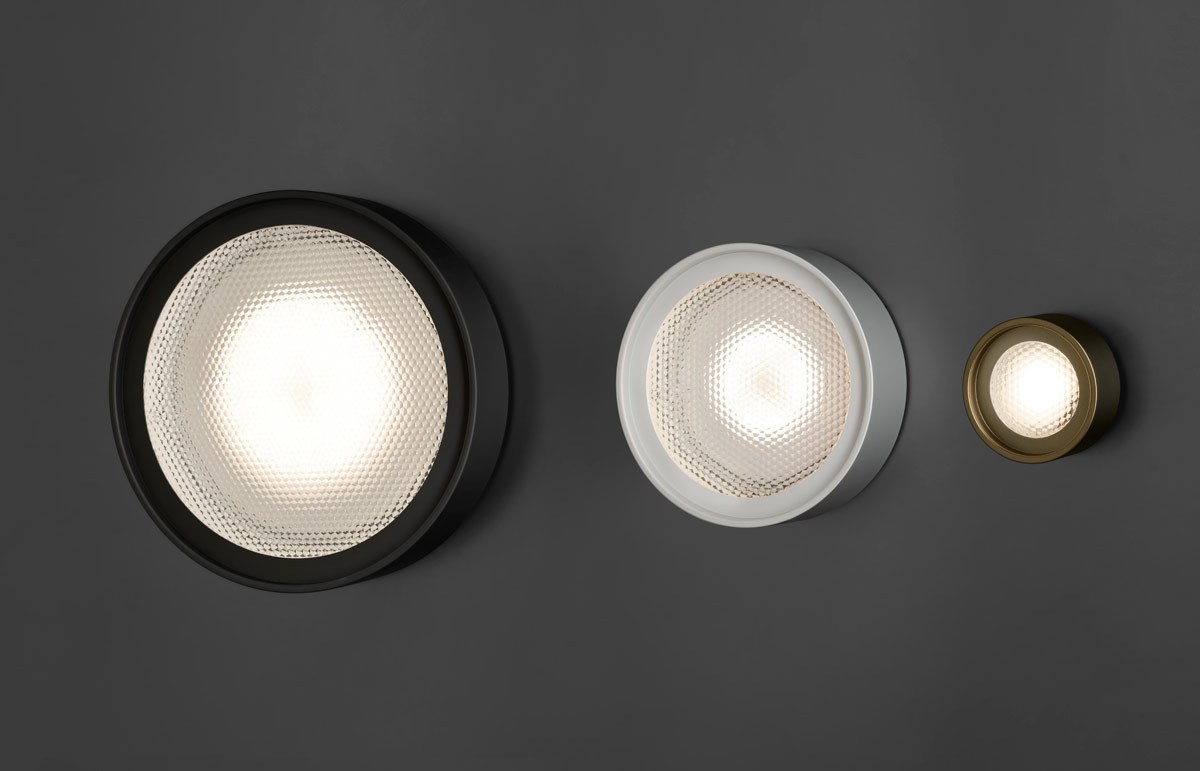 I colori – avorio totale o nero opaco con paralume verde inglese – amplificano la versatilità progettuale di una linea pensata per contesti contemporanei, raffinati e anche contract. Particolarmente poetica è la versione applique, con il disco in PMMA a nido d’ape che diffonde una luce delicata, perfetta per percorsi, pareti o facciate.