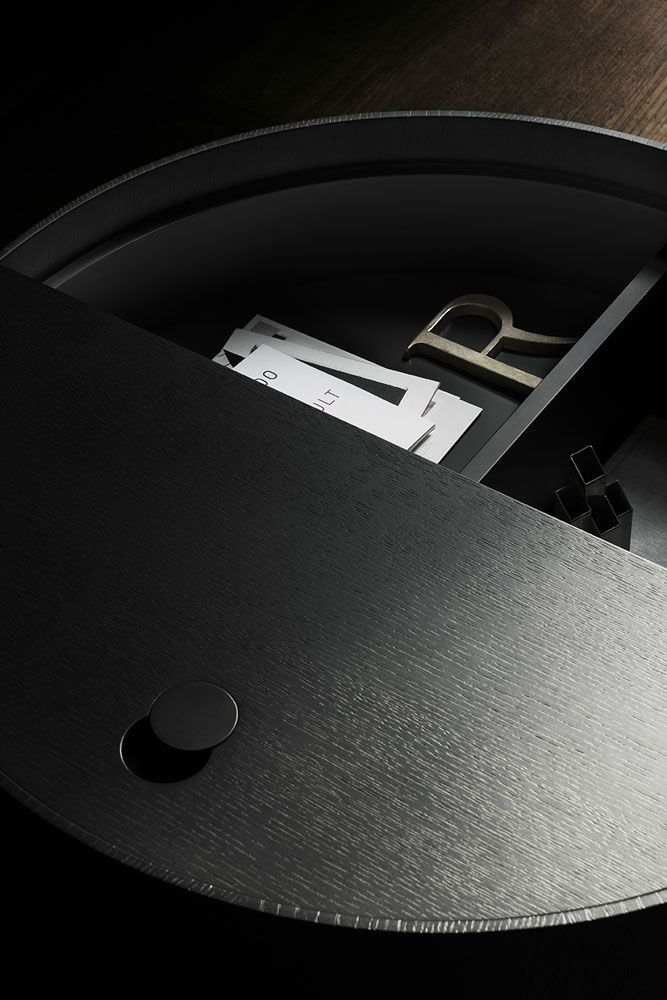 - Com’è fatto E’ realizzato in rovere naturale o tinto carbone, con la finitura in vernice acrilica ad acqua. Misura cm d 70x33h e ha il top composto da un’anta fissa e un’anta a ribalta, unite da cerniere con apertura a 180°. Il vano interno ha un contenitore girevole a 3 scomparti. Riprende il progetto Moon nato come comodino, a cui si aggiungono anche le varianti Moon Eclipse, un cilindro basso e ampio accostato ad un contenitore satellite apribile lateralmente e Moon Satellite, un contenitore su ruote con due vani di diverse dimensioni.