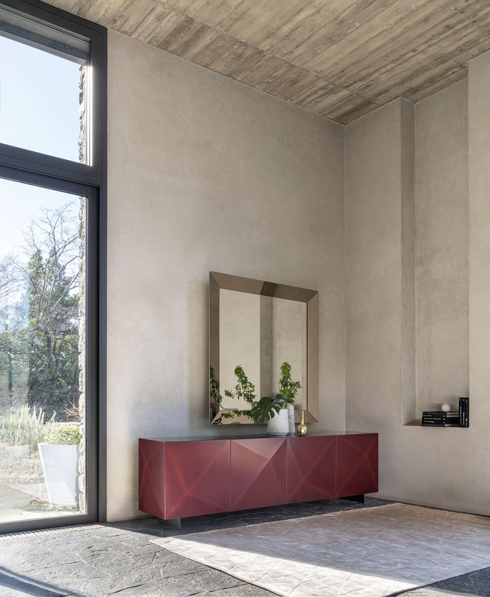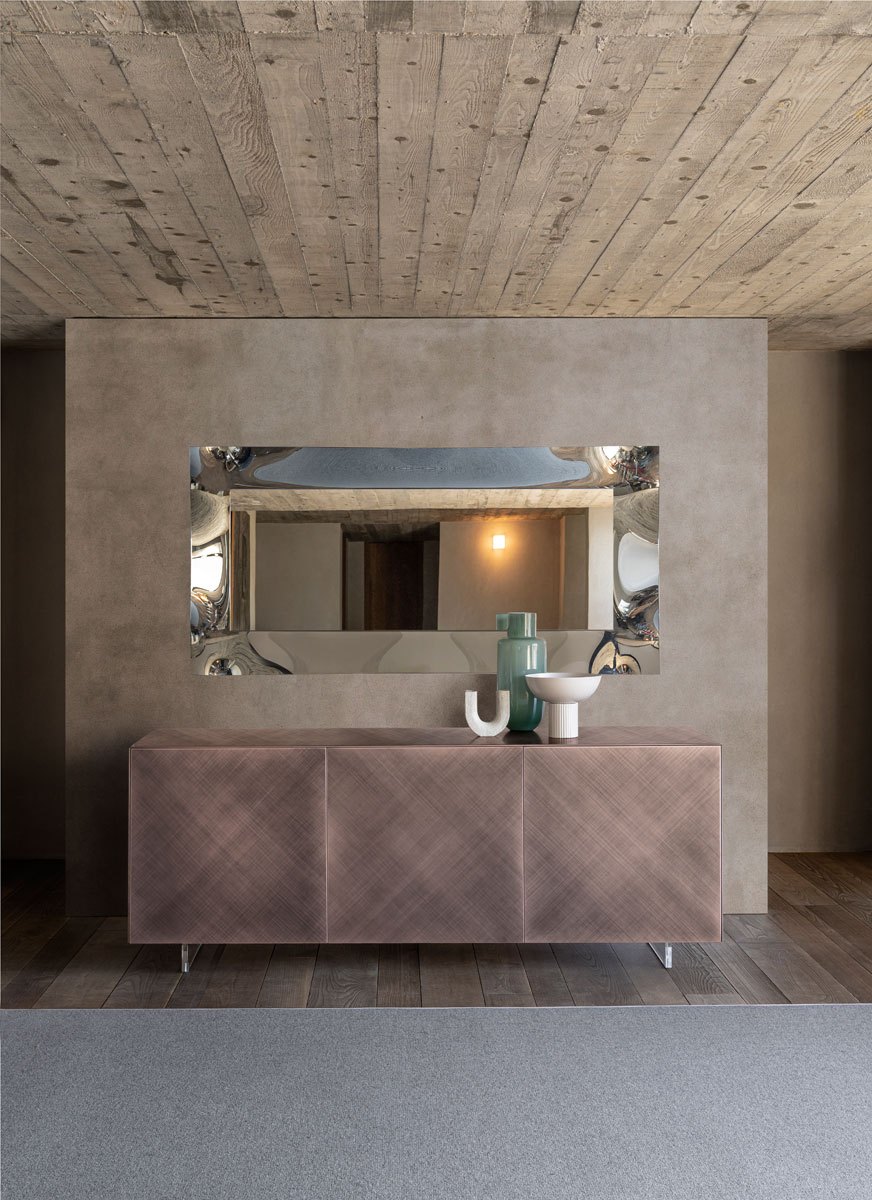La madia Cubric esprime la purezza geometrica del design, valorizzando un suggestivo gioco di volumi e linee attraverso un raffinato chiaroscuro ottenuto dalla lavorazione dell’acciaio o dalla spazzolatura del colore. La lucidatura manuale introduce piccole irregolarità di riflessione, rendendo ogni pezzo unico.