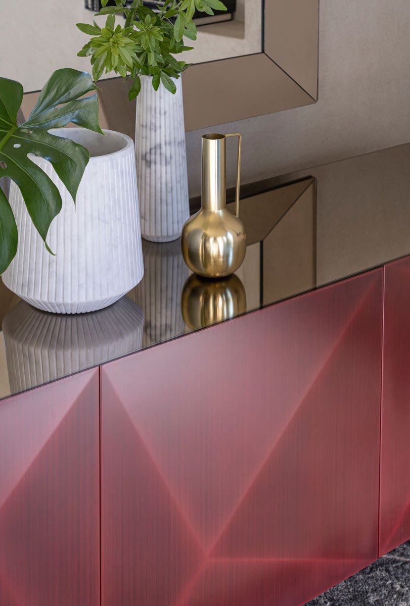 La speciale lavorazione a diamante su ante e fianchi aggiunge un ulteriore tocco di raffinatezza. Ora, la collezione Cubric presenta la finitura Rubino spazzolato a mano, accentuando la sua particolare lavorazione a diamante su ante e fianchi.
