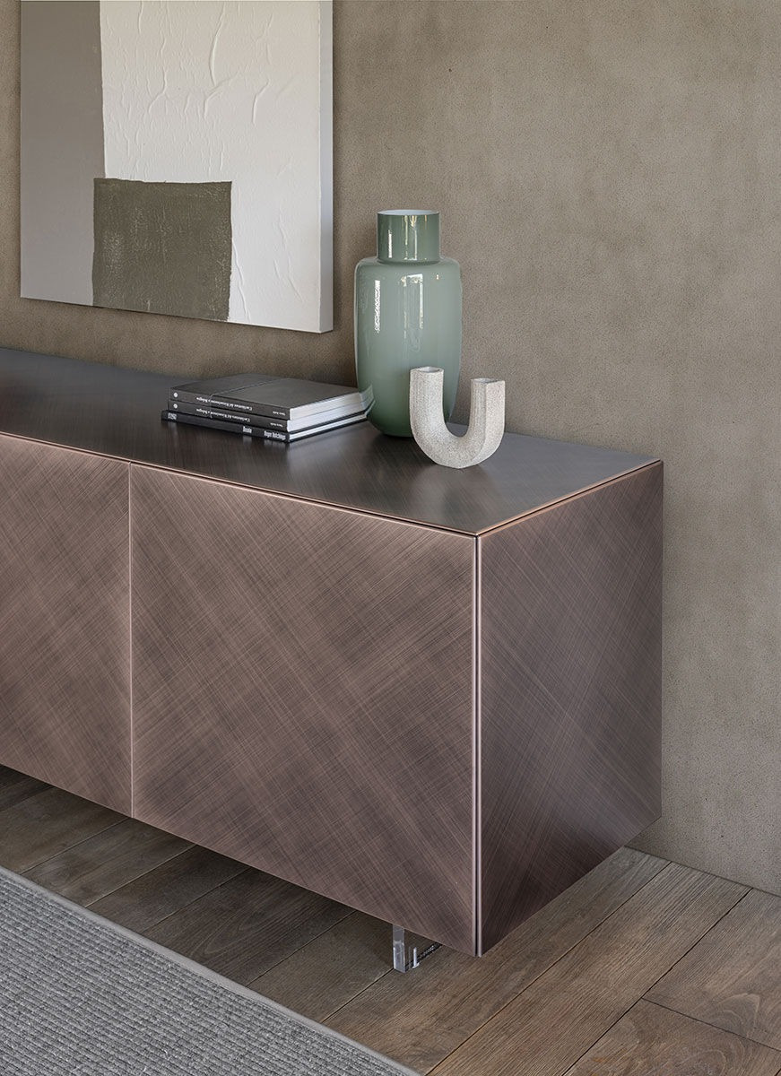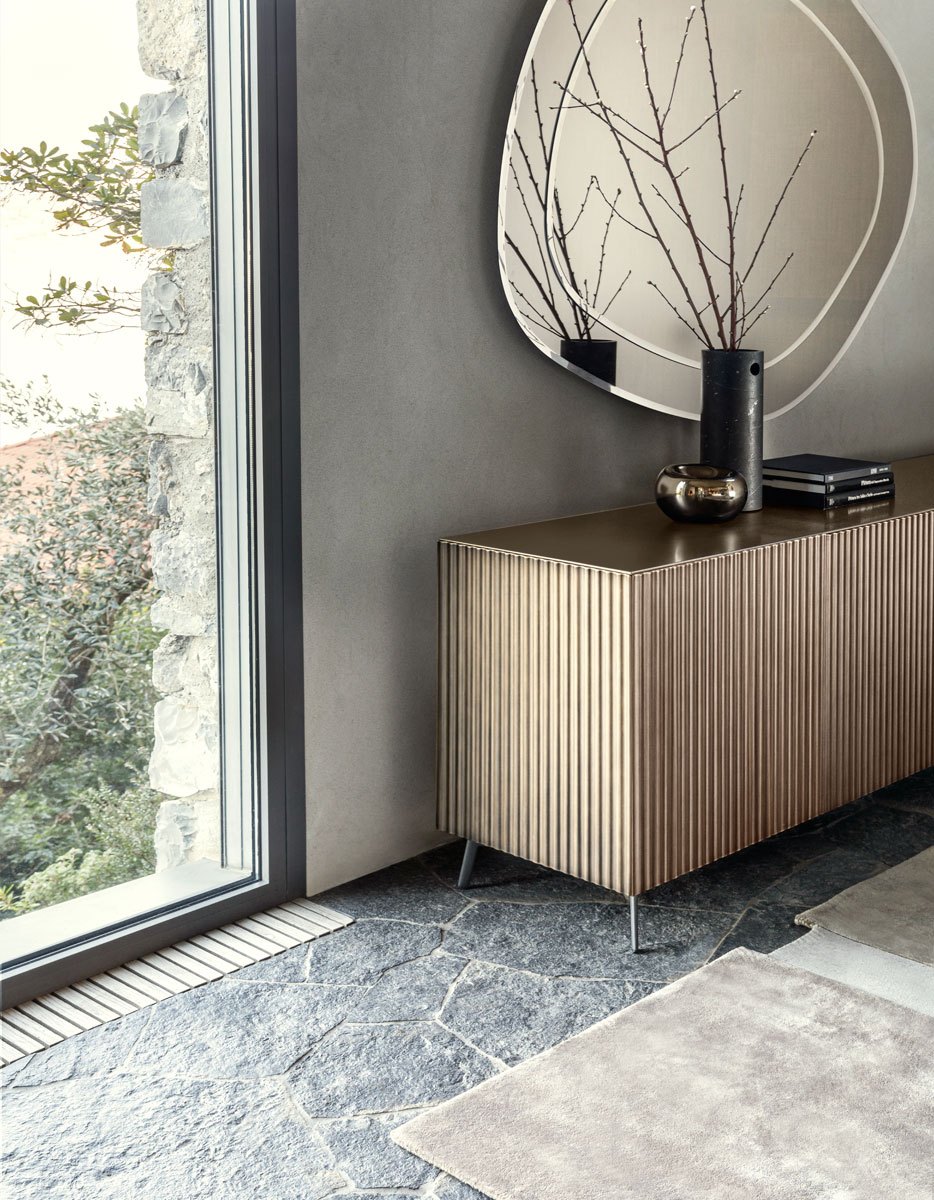Il risultato è un mobile di forme essenziali ma di grande impatto visivo. La madia Onda si presenta con una nuova lavorazione in ottone spazzolato su ante e fianchi, enfatizzando ulteriormente la tridimensionalità e il gioco di chiaroscuri con una preziosa e sofisticata scenografia di luci e ombre.