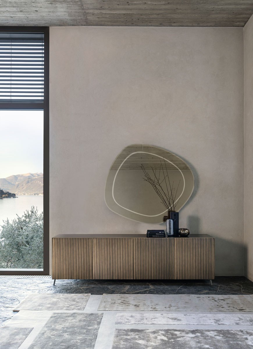 Attraverso la ricerca attenta in termini formali e tecnologici, la madia Onda di Riflessi trae ispirazione dalla geometria, incorporando il concetto di linea con una dimensione tridimensionale e un affascinante gioco di chiaroscuri grazie alle incisioni verticali su ante e fianchi.