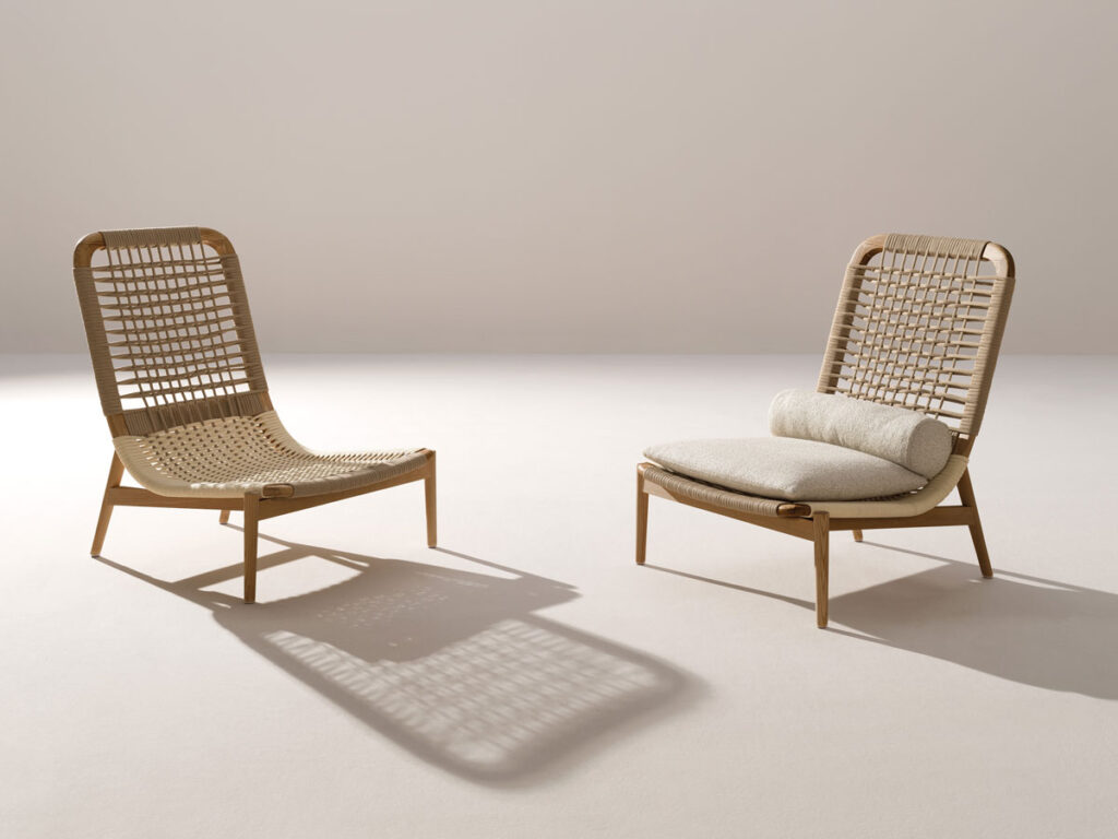 La struttura in legno di iroko e il raffinato intreccio in corda definiscono una silhouette fluida che valorizza ogni contesto outdoor, dal giardino urbano alla terrazza vista mare. Il comfort è garantito da cuscini sfoderabili in tessuti tecnici, pensati per resistere con stile.