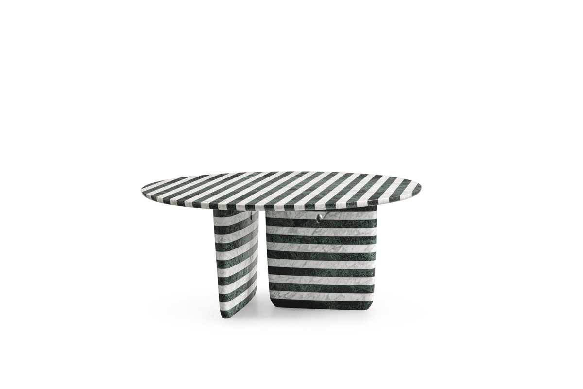 Materiali e lavorazione si ispirano all’Italia, alla lunga tradizione manifatturiera e al Duomo di Siena: le strisce di marmo bianco Carrara e verde Alpi ricordano infatti lo stile romanico gotico della cattedrale e sono “assemblate” con una tecnica manuale di altissimo artigianato, che richiede processi lenti e sapienti. Tobi-Ishi si veste così di uno stile ancora più prezioso ed esclusivo, mentre la famiglia Tobi-Ishi si amplia con nuove dimensioni e finiture. Oltre all’Edizione Speciale, infatti, B&B Italia presenta tra i nuovi modelli una sorprendente versione rettangolare lunga 310 cm e larga 114 cm, una vera e propria sfida tecnica per un tavolo per 10 maestoso e regale, mentre la versione rotonda si veste di legno di olmo naturale, nell’elegante nuance miele. Infine, alla gamma di tavolini Tobi-Ishi si aggiunge il modello indoor nella nuova versione in marmo bianco Carrara “venatino statuarietto” opaco e marmo nero Marquinia lucido. La nuova collezione di B&B Italia è un insieme di pezzi dall’allure sofisticata che reinterpretano, sapientemente, l’intramontabile savoir-faire italiano. Per un mood contemporaneo di classe.