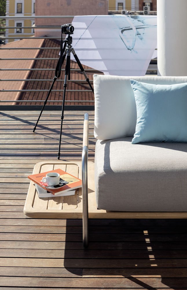Per la terrazza metropolitana, design e comodità come si ci trovassimo in soggiorno. Su un piano in teak che sporgendo oltre i braccioli fa da tavolino, grandi cuscini imbottiti garantiscono la comodità. E se preferiamo leggere da sdraiati, possiamo scegliere direttamente il divano.