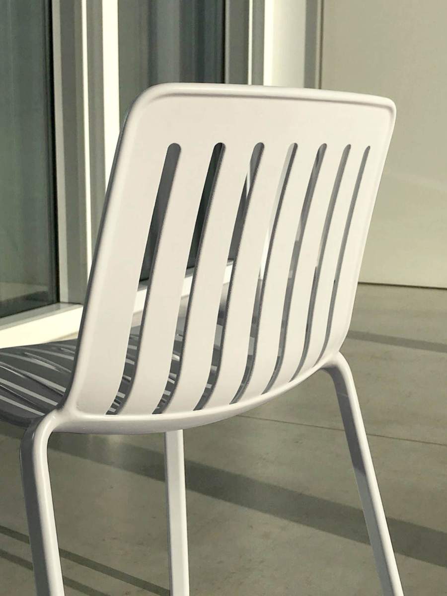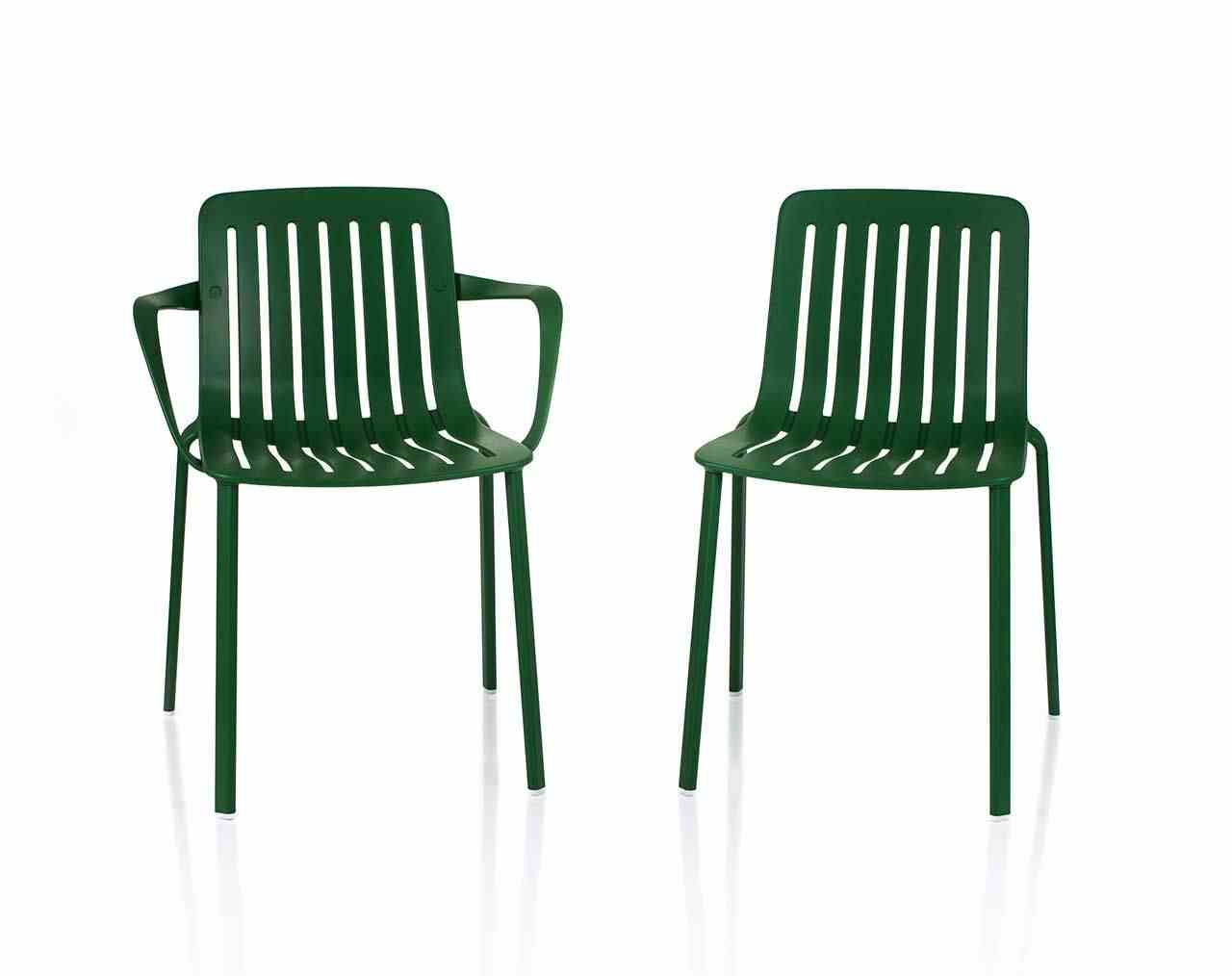 - Com’è fatto Plato è una sedia impilabile con o senza braccioli realizzata in alluminio. Sedile e schienale sono un pezzo unico (in pressofusione di alluminio) caratterizzato da sette tagli, larghi il giusto per essere comodi e funzionali al tempo stesso, mentre per le gambe è stato utilizzato un resistente tubolare di alluminio verniciato poliestere. La gamma dei colori prevede sei tonalità: verde, argento, azzurro, bianco, nero e rosso.