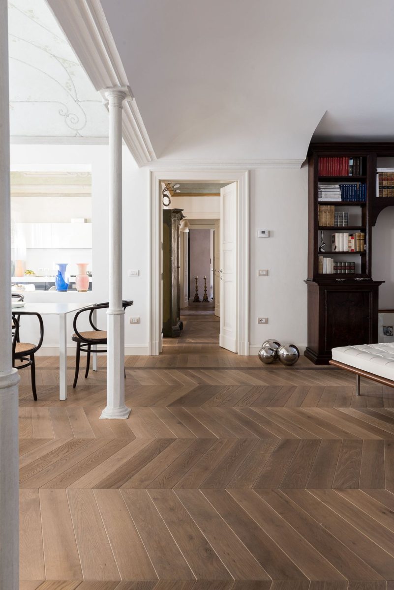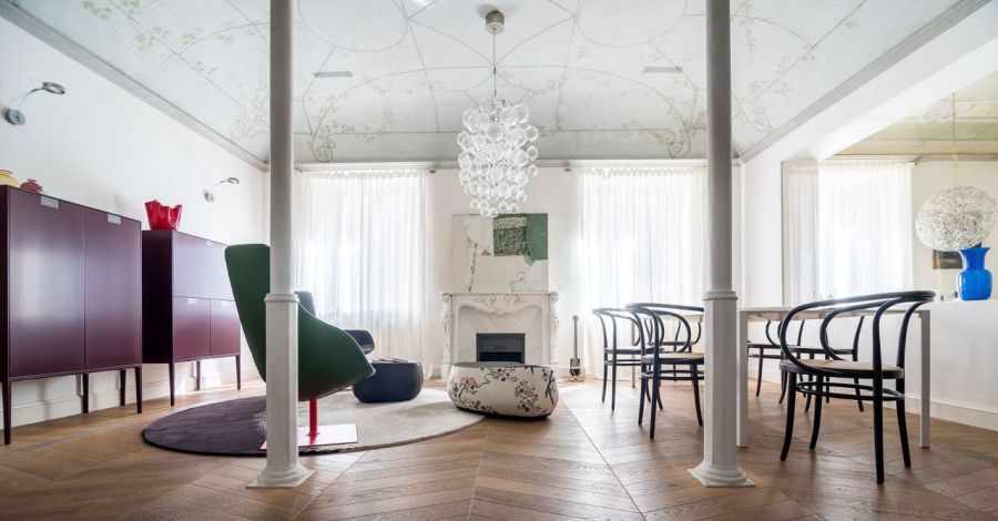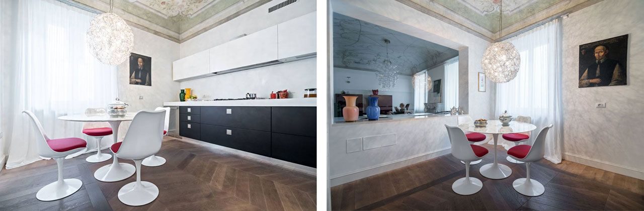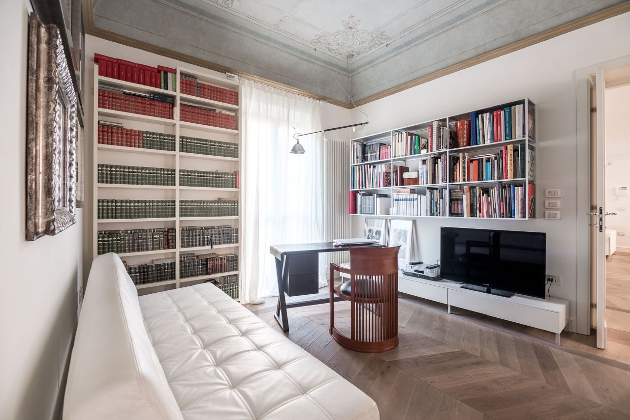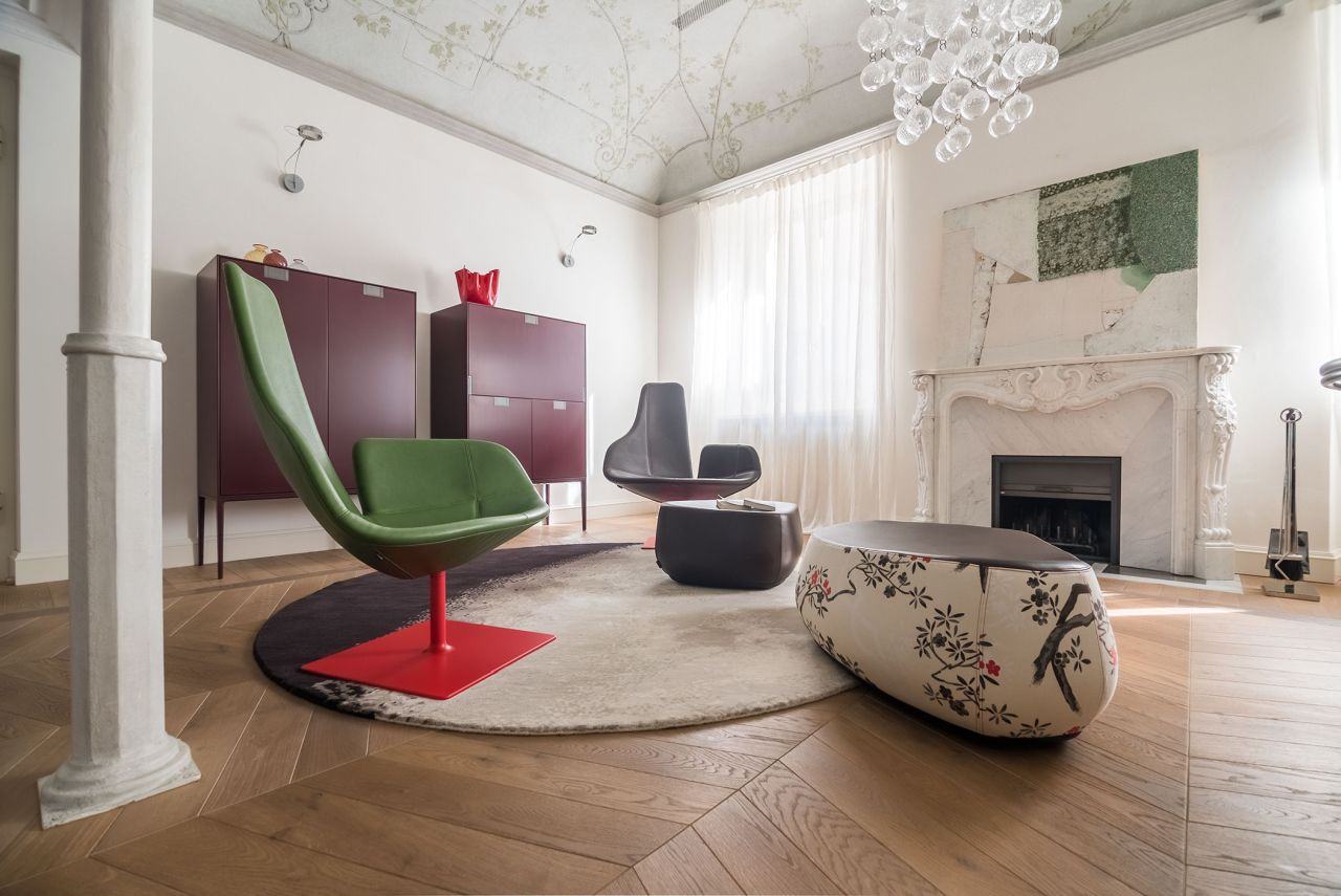 I lavori di ristrutturazione dell’intero palazzo erano in corso quando i nuovi proprietari l’hanno scoperto. Responsabile del risanamento era Antonella Celeschi e vista immediata sintonia, le hanno affidato il progetto d’interni della loro futura casa. Insieme hanno concepito un appartamento che ama la storia con le sue meraviglie e abbraccia il meglio dell’arredo moderno, protagonista assoluto degli spazi. Dagli intramontabili mobili “pre-design” come le sedie Thonet nella zona del camino, ai grandi classici del moderno disegnati da Mies van de Rohe, Eero Saarinen e Frank Lloyd Wright, al contemporaneo interpretato da Achille Castiglioni, Antonio Citterio, Patricia Urquiola e Borek Sipek.