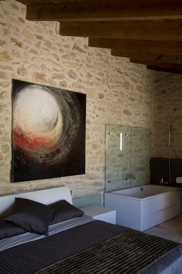 La bellezza di una casa rustica, con i suoi muri grezzi e i listoni in legno cerato, è esaltata dall’arredo moderno che con colori chiari e decisi porta una aria fresca in casa.