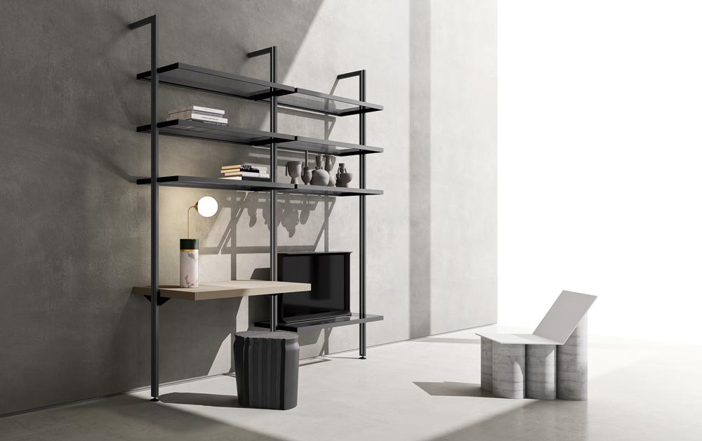 Cabina Windy, invece, è un sistema a giorno composto da pali a parete e soffitto, con luci Led sul fianco, mensole in vetro e una mensola che funge anche da scrittoio. Elegante e discreto, è perfetto sia nella zona living che in quella notte perché si integra perfettamente con lo stile domestico.