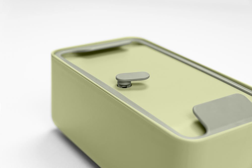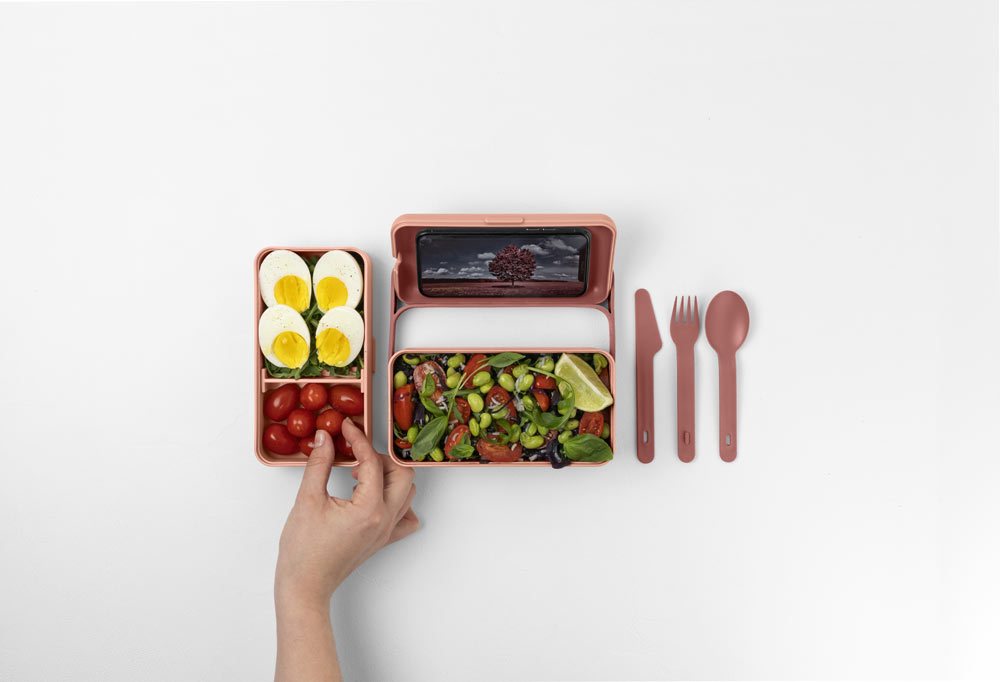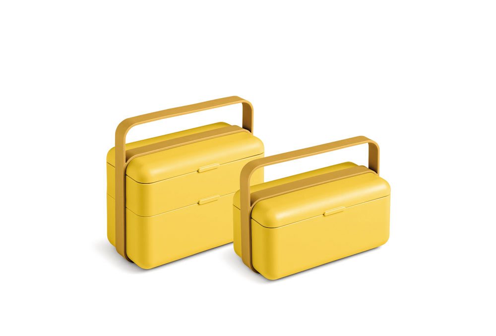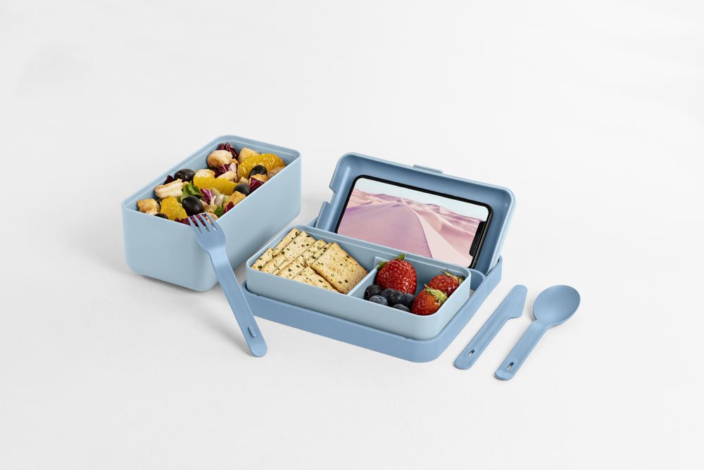 - Com’è fatto E’ una sorta di upgrade del classico porta pranzo, studiato per offrire la massima funzionalità. Formato da due capienti contenitori in polipropilene riciclabile, in due misure diverse e con separatore (per poter inserire almeno tre alimenti differenti, anche liquidi), ha il coperchio ermetico, un set di posate e una cinghia gommata che ne facilita il trasporto. In più ha la valvola di sfiato studiata per metterlo direttamente nel microonde e il coperchio che si trasforma in un pratico supporto per il cellulare, con tanto di foro per il cavo di ricarica o le cuffie. Disponibile in due dimensioni e sei colori mat che passano dal Flamingo Pink al Carbon Black.