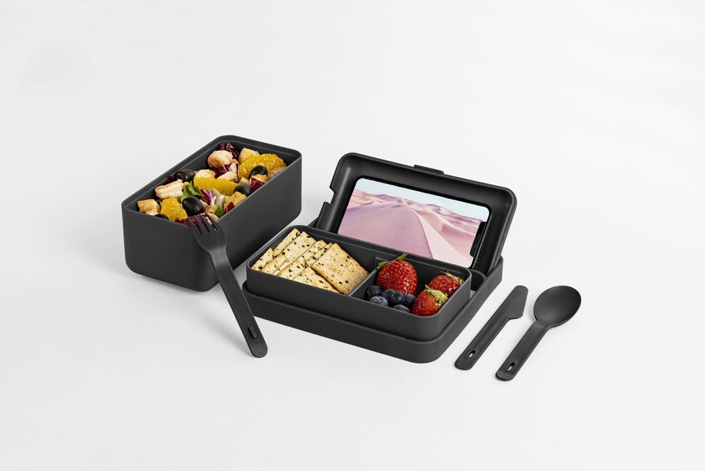 - Ci piace perché… Ricorda i classici bento, i contenitori per il cibo giapponesi, a cui aggiunge due peculiarità che rispondono perfettamente alle nuove esigenze contemporanee: il materiale riciclabile e i dettagli studiati per ospitare e utilizzare il cellulare.