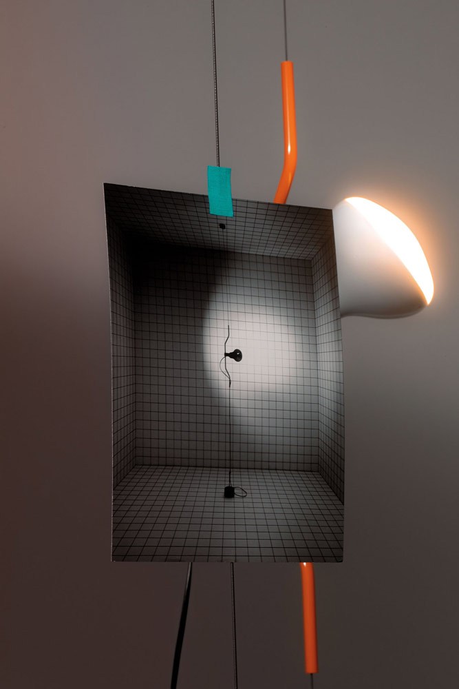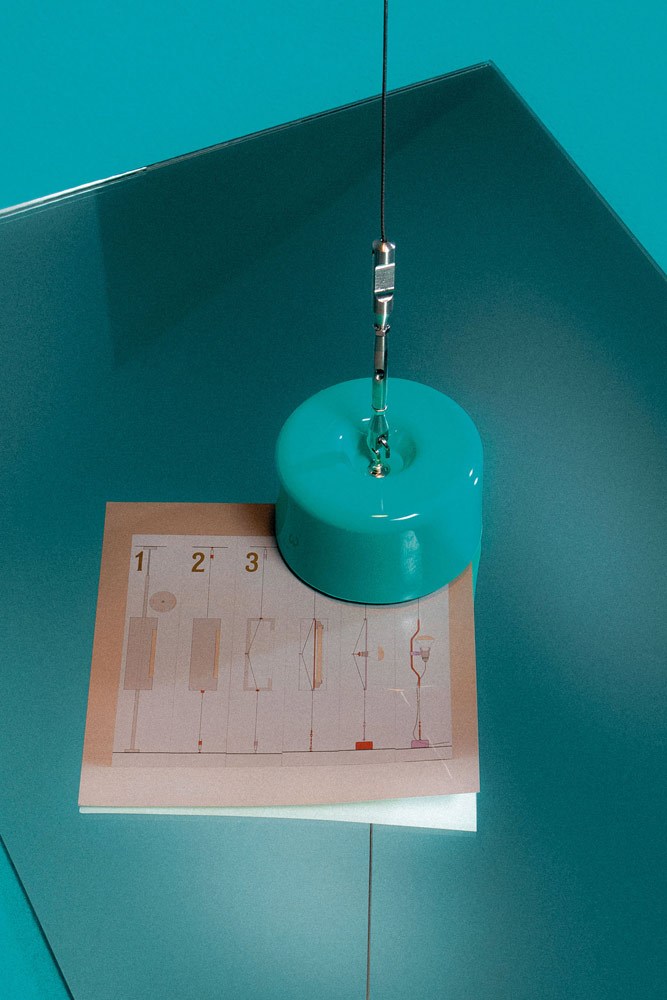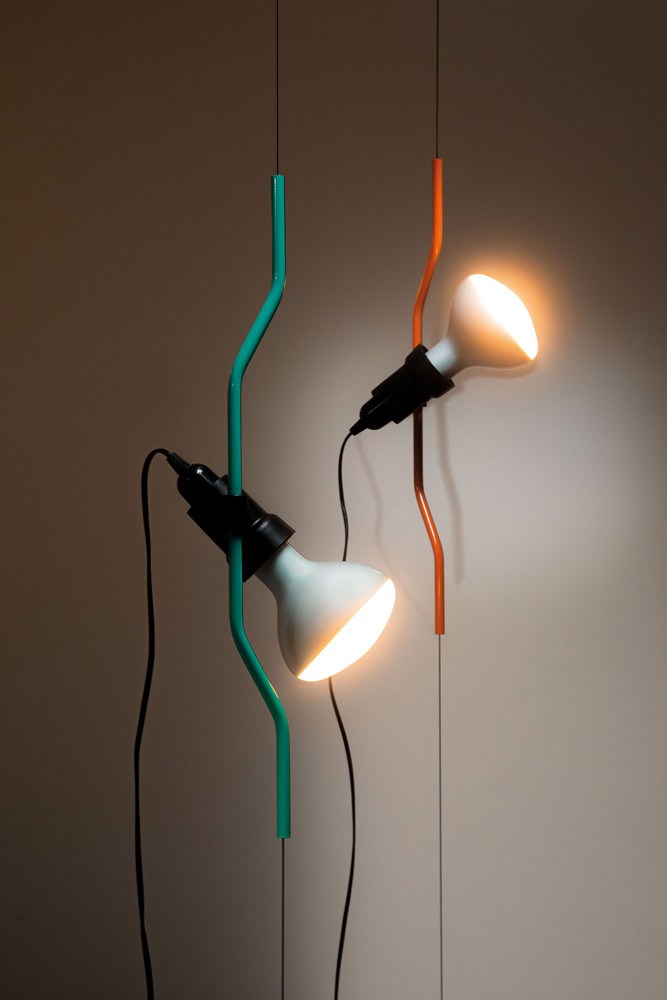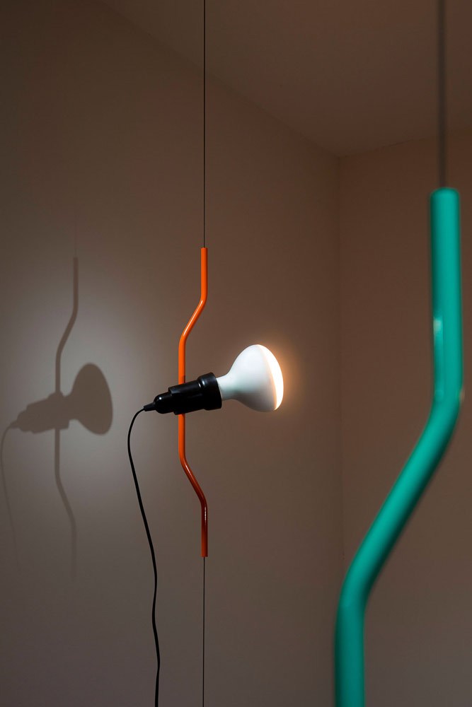 Regolabile in altezza, ruotabile a 360°, orientabile a piacere, questa lampada “essenziale” permette infinite scenografie. Un vero capolavoro di ingegneria, formato da un cavo d’acciaio, un contrappeso cilindrico, un tenditore da barca a vela, un disco circolare con gancio da fissare a soffitto, il porta-lampada con giunto rotante, il sostegno a forma di parentesi e la lampadina spot a vista. Tutti scomposti e imballati in un kit di plastica e sottovuoto, da portare a casa come una valigetta.