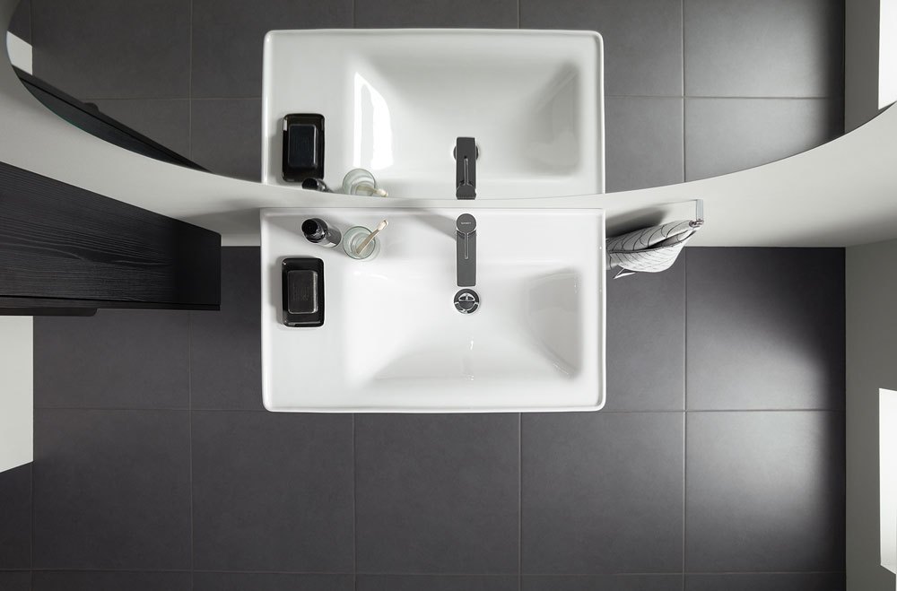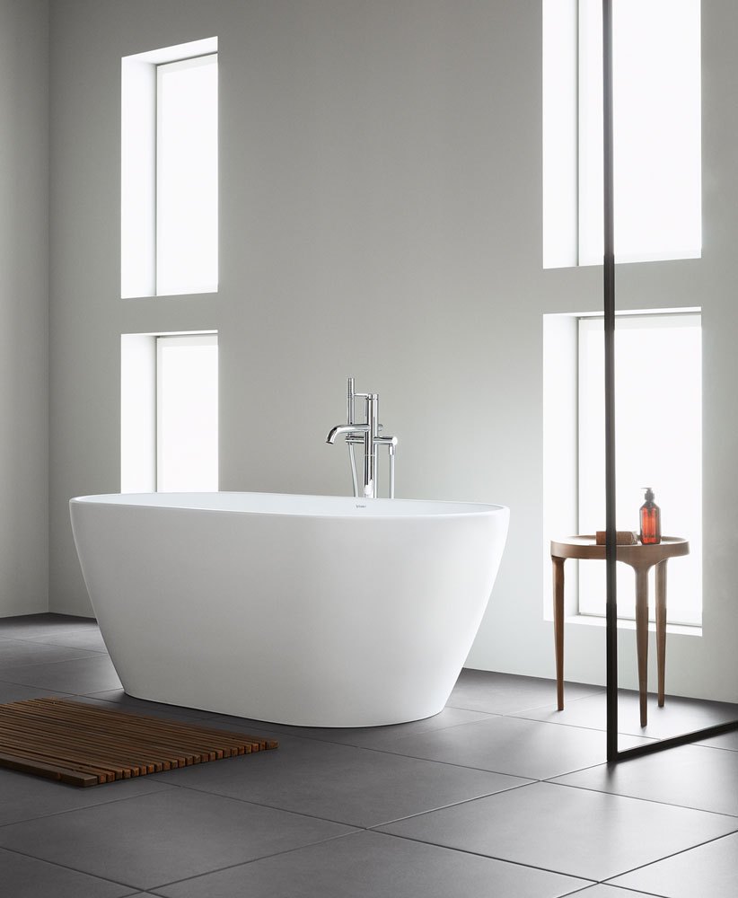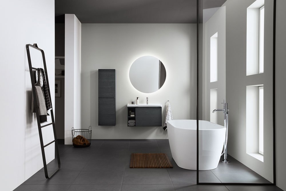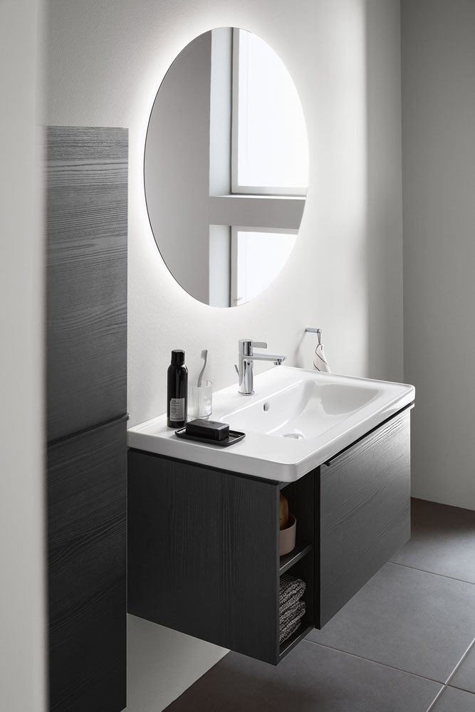 • Com’è fatta E’ una collezione bagno completa che comprende sanitari, rubinetteria e mobili. E’ composta da lavabi con i bordi sottili di tutti i tipi (lavabi, lavabi consolle, da incasso, lavamani e bacinelle ovali e tonde), soluzioni sottolavabo asimmeriche con piano d’appoggio laterale, vasi con tecnologia Duravit Rimless® disponibili anche con smalto antibatterico HygieneGlaze e bidet abbinati. Pezzo forte della collezione è la vasca a centro stanza in DuraSolid®, con finitura vellutata, perfetta anche per i bagni dalle dimensioni più contenute (è lunga solo cm 160), che si aggiunge alle vasche da incasso in acrilico sanitario con schienale inclinato in cinque dimensioni (da 150×75 a 180×80 cm), anche in versione idromassaggio con sei bocchette piatte acqua/aria laterali. Non mancano i mobili in diverse misure, da 41 a 140 cm, in tre nuovi bilaminati effetto legno, con 13 finiture diverse e maniglia ergonomica in Nero diamante, da abbinare agli specchi tondi della serie Luci e agli specchi universali con luce LED. Infine, tutti i sanitari sono accessoriati con la rubinetteria da linee geometriche e semplici, con una manopola stretta posizionata verticalmente e si possono scegliere anche i miscelatori con speciale funzione FreshStart, per il risparmio energetico.