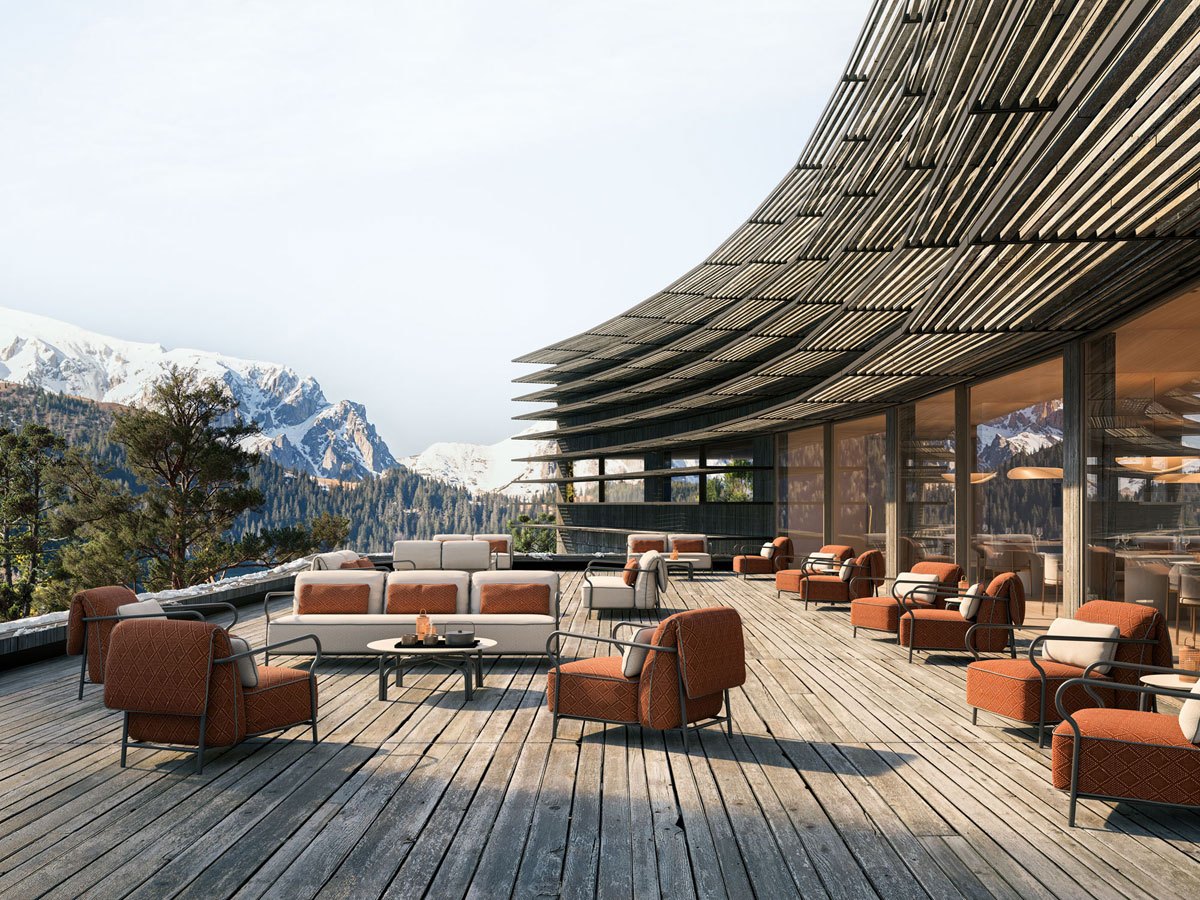 Le forme di questi arredi da esterno, sono morbide ma precise, pensate per accogliere lo sguardo senza imporsi, con braccioli curvi e profili continui che danno ritmo e armonia all’intero insieme.