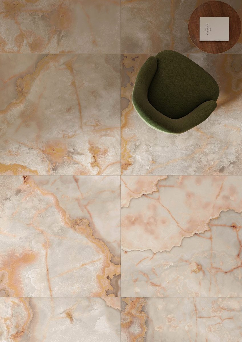 Onici invece, la seconda collezione già disponibile in cinque colori (Avorio, Bianco, Ghiaccio, Miele e Quarzo), si arricchisce di tre nuove tonalità: Onice Arancio, Onice Grigio e Onice Perla. Ogni lastra, unica e irripetibile, viene proposta in sei formati (60×60 cm, 60×120 cm, 120×120 cm e 120×278 cm, 90×90 cm e 90×180 cm), con due spessori da 6.5 mm e 10 mm e con superficie honed e lucida.