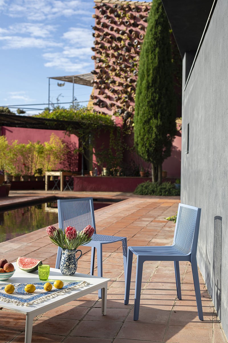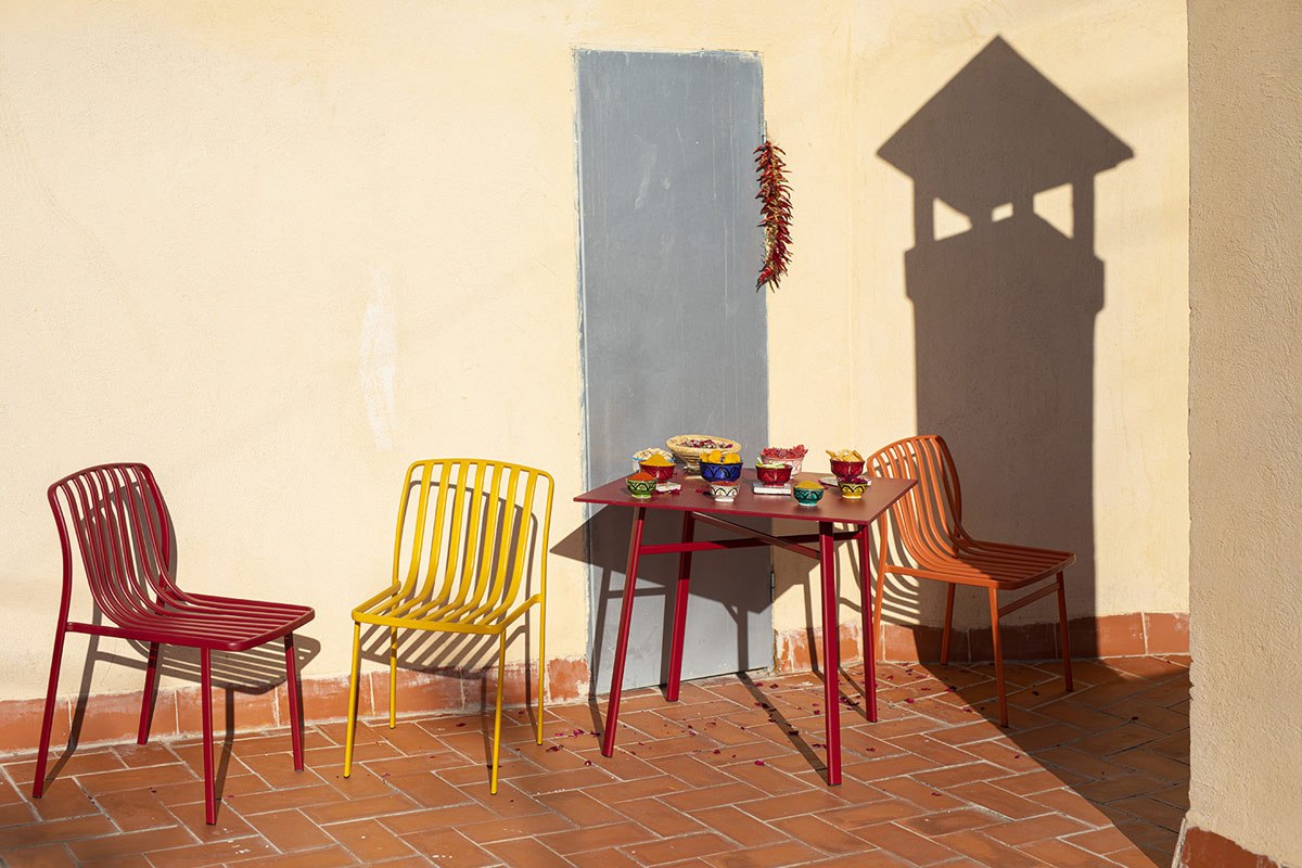 Così, mentre la chaise longue scultorea, ma praticissima di Walter de Silva e Mario Antonioli (è nata da profili di sezione rettangolare in acciaio curvato ed è pieghevole) si fa emblema e vessillo del nuovo brand, le sedie e poltroncine Bangi disegnate da Altherr Désile Park puntano alla praticità, scegliendo forme sinuose a tutta ergonomia e strutture impilabili nei colori della primavera, dal giallo sole all’azzurro cielo, dal verde erba al rosso della terra. La collezione in lega di alluminio e acciaio Jos di Simone Bonanni, invece, ci invita in un bistrot parigino, tra sedie, divanetti, tavoli, panche e poltroncine che strizzano l’occhio alla tradizione, mentre la famiglia Gao, dello stesso designer, regala tridimensionalità a un foglio di acciaio per introdurci a un’estetica archetipica, sottile, ma robustissima. Denis Barbiero, a sua volta, ci accoglie con Kano e Kissi, un connubio di produzione industriale e lavorazioni artigianali, estetica Bauhaus e dettagli curati, perfetti ibridi indoor e outdoor. A chiudere il catalogo è Melik, firmata da BrogliatoTraverso, che come un ossimoro piega la forza dell’acciaio in volumi delicati che mandano in scena il lato rassicurante e chic di tavoli, divanetti e sedute di carattere.