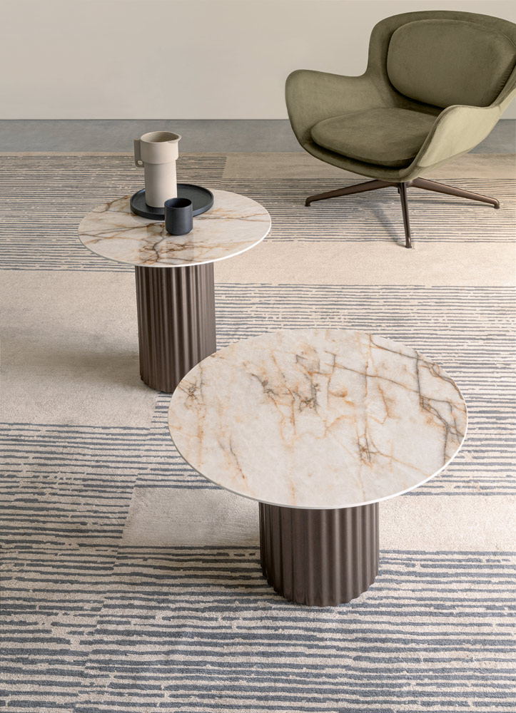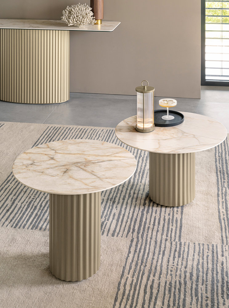 I Tavolini Enea, proposti in due versioni (Big e Small), riprendono il motivo cannettato dell’omonimo tavolo con proporzioni più compatte. Le basi cilindriche cannettate, abbinate a piani in ceramica da 6 mm, diventano elementi versatili per il living contemporaneo.