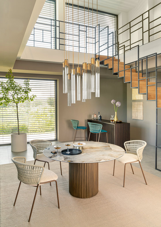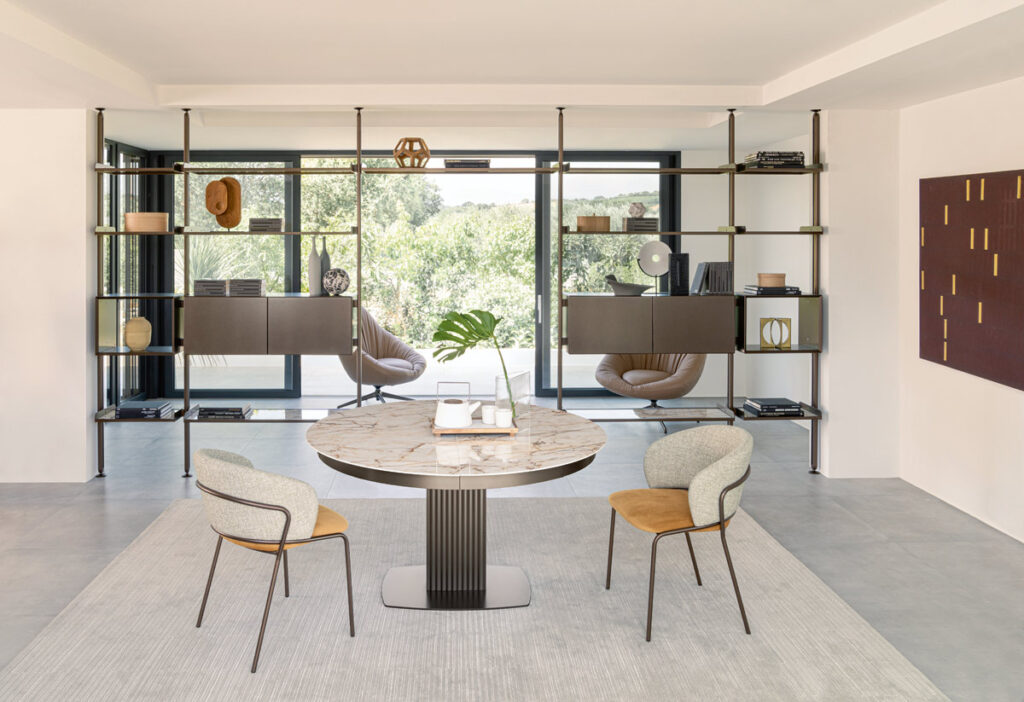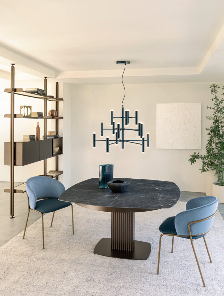 Il piano fisso o allungabile, in ceramica bisellata stratificata su cristallo, è disponibile in versioni rotonda, rettangolare o a botte, con una gamma di oltre venti finiture lucide e opache. Le tonalità spaziano dal Calacatta al Patagonia, fino alle versioni più materiche e satinate. Le finiture metalliche della base – ottone, titanio, cobalto o rubino – vengono spazzolate a mano, esaltando il pregio artigianale del metallo.