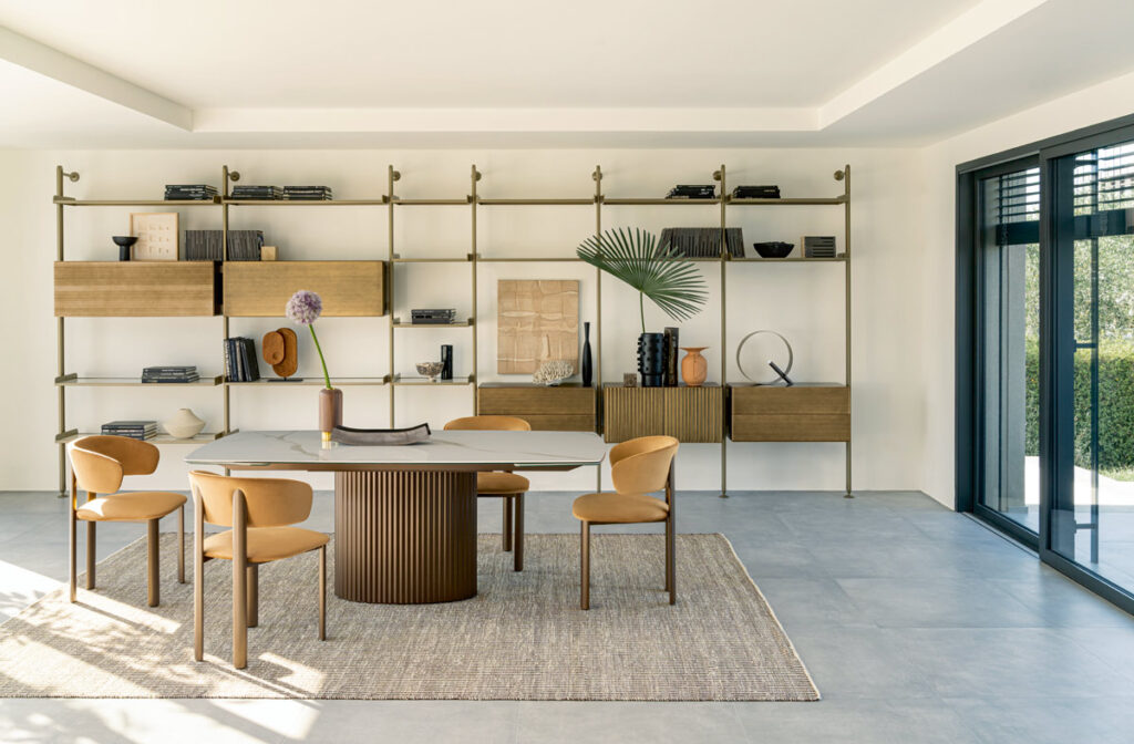 Il risultato è un linguaggio raffinato che unisce tradizione artigianale e visione contemporanea. Ogni cannettatura, modellata e spazzolata manualmente, racconta il gesto del maestro artigiano e la cura del dettaglio tipica del brand. Tavoli, madie, tavolini e librerie diventano così elementi di un racconto coerente, dove il segno del cannettato si trasforma in pura espressione di stile.