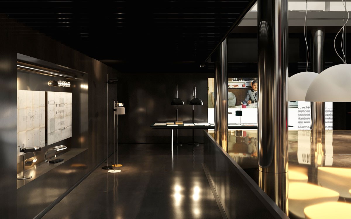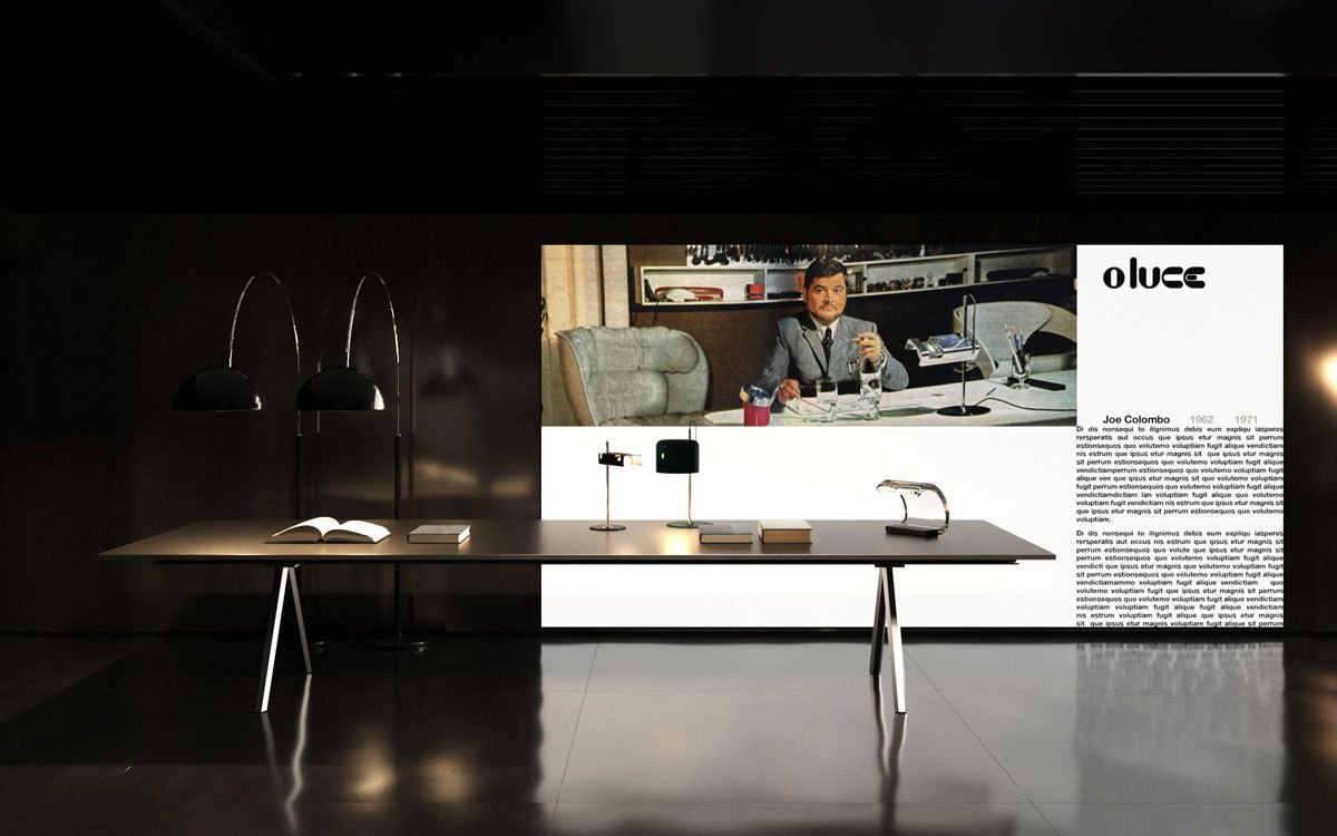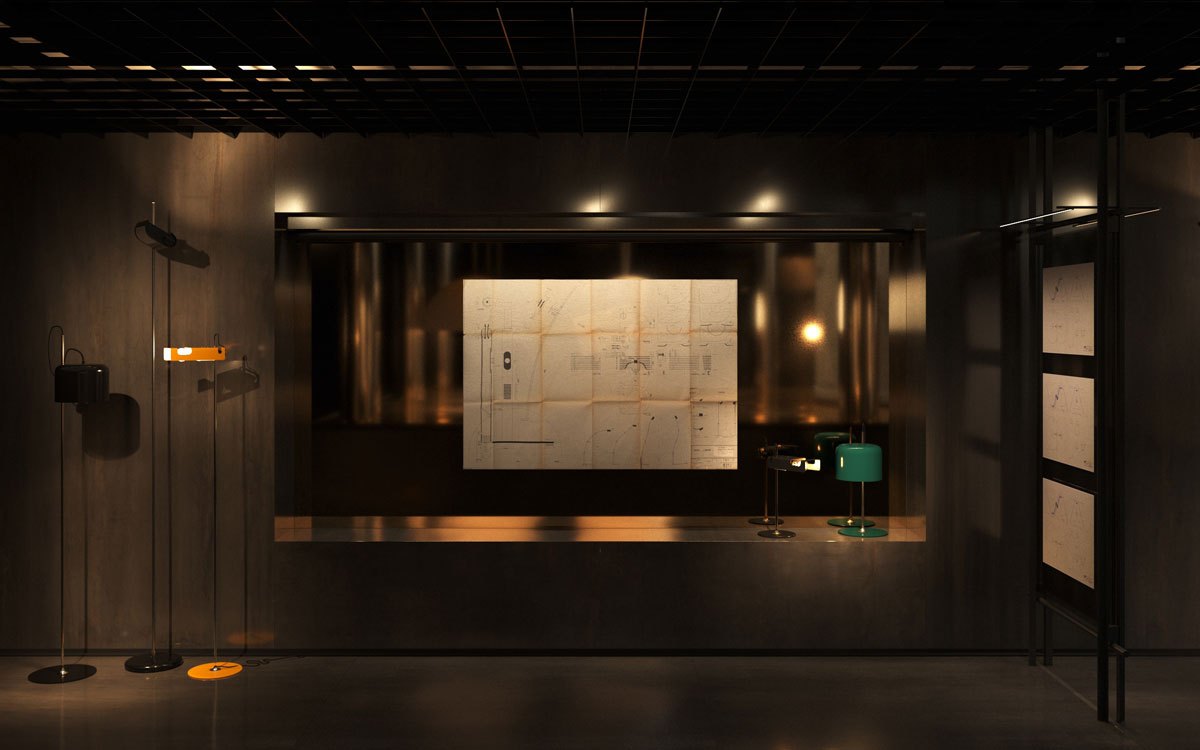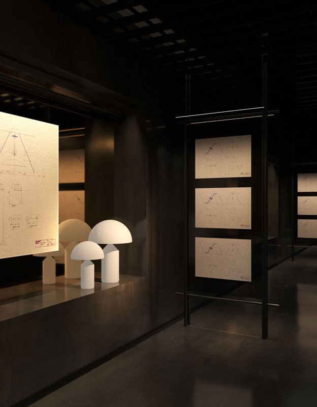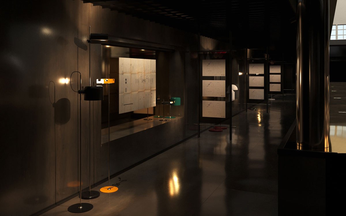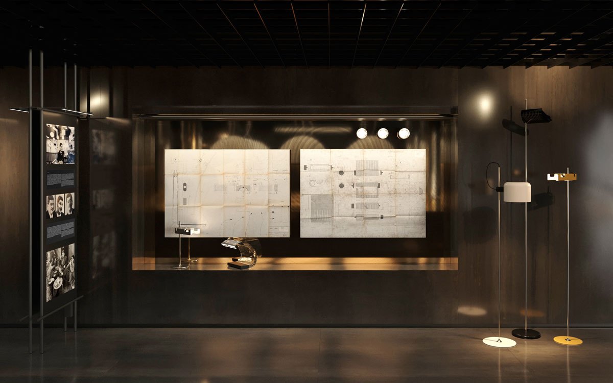 Uno degli aspetti più interessanti dell’esposizione è la traduzione tridimensionale in tre volumi esaustivi ,del patrimonio editoriale di Oluce. Disegni originali, schizzi e fotografie d’archivio vengono messi in dialogo diretto con i prodotti finiti.