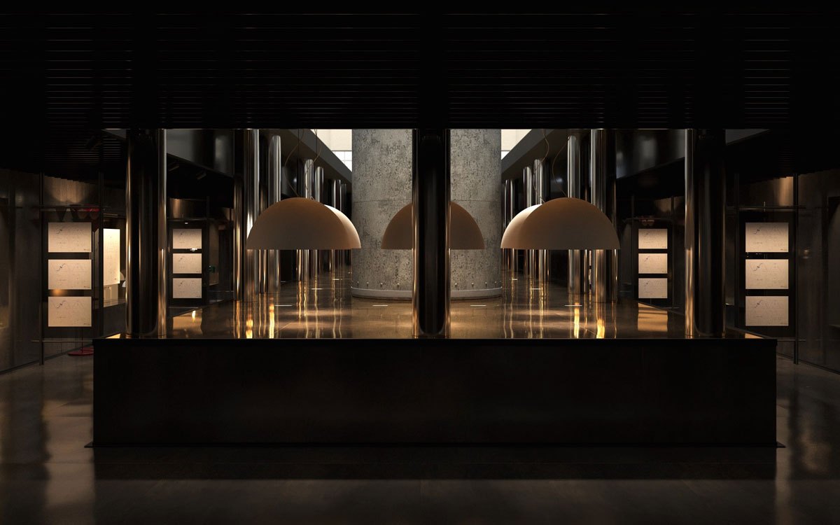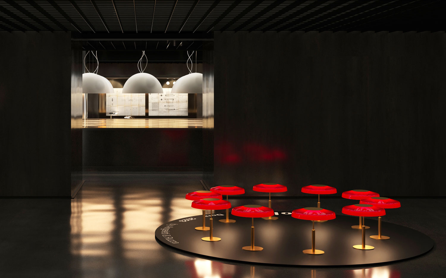 Il percorso si sviluppa attorno a una pedana centrale, seguendo un tracciato circolare che guida lo sguardo e il corpo. Le lampade emergono dall’oscurità come presenze autonome, ciascuna con un proprio ritmo e una propria intensità. La luce non illumina semplicemente gli oggetti: li racconta.