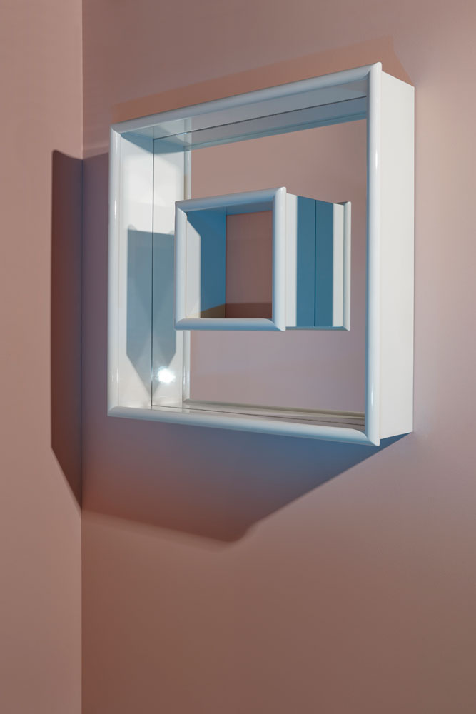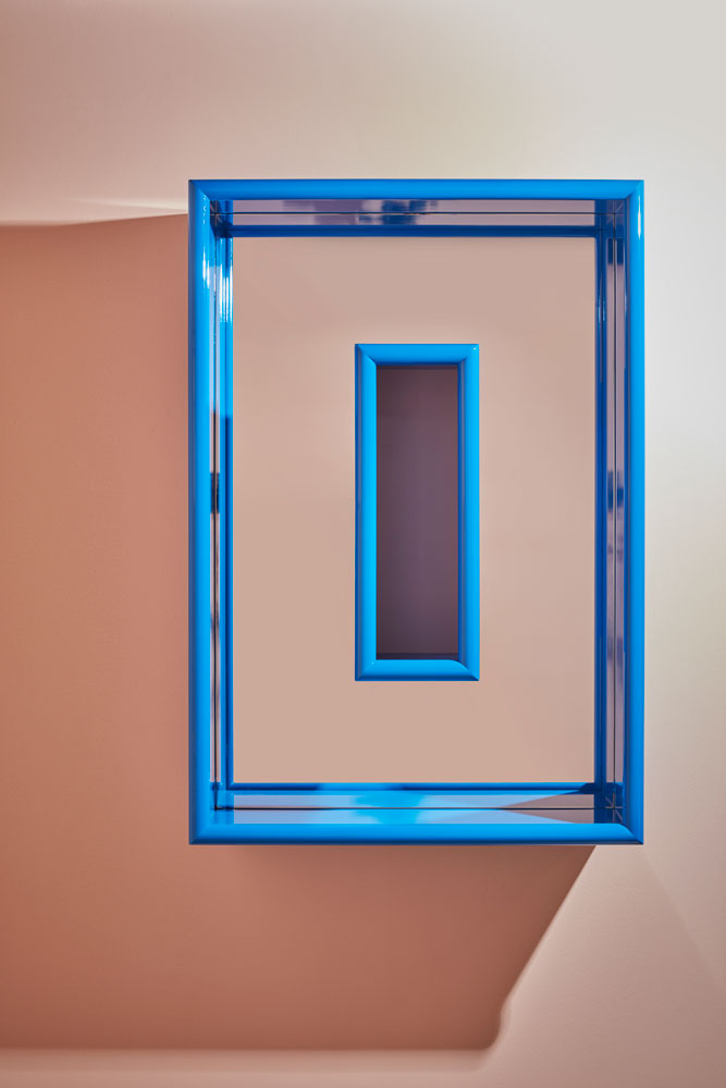 “Atrio”, invece, gioca con il concetto di soglia. Il vuoto centrale diventa parte del progetto e l’oggetto si trasforma in un ibrido tra specchio, scultura e mensola. Il riflesso non è solo funzione, ma elemento narrativo. Con linee nette e dettagli cromatici audaci, Arezzi ridisegna un gesto quotidiano attraverso una forma nuova e sorprendente.