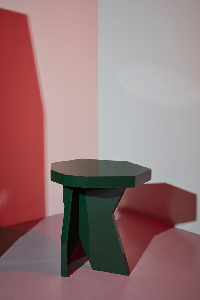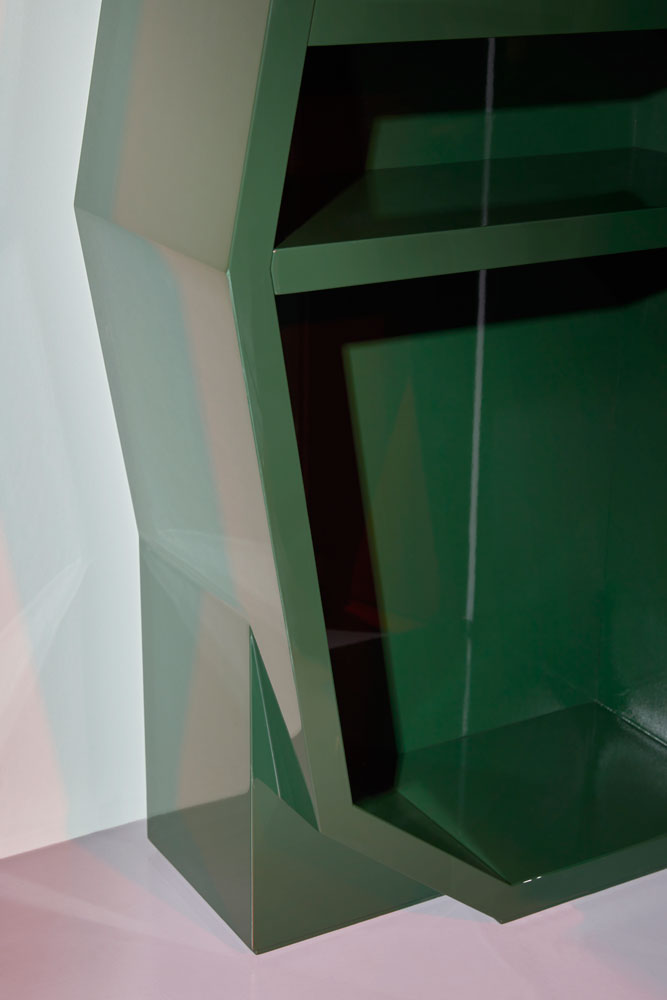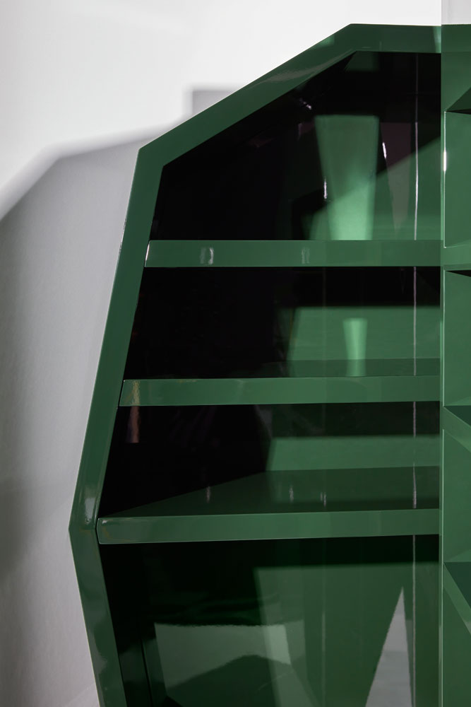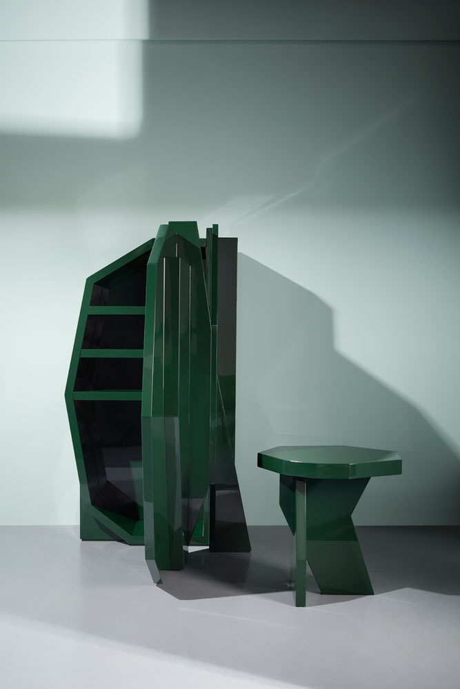 Il cabinet e il tavolino, entrambi in legno massello laccato lucido, si distinguono per i volumi scolpiti, le sfaccettature geometriche e la forza espressiva che li rende simili a micro-architetture. Verde intenso, forme spigolose ma armoniche: van Eijk crea oggetti emozionali, che abitano lo spazio come presenze.