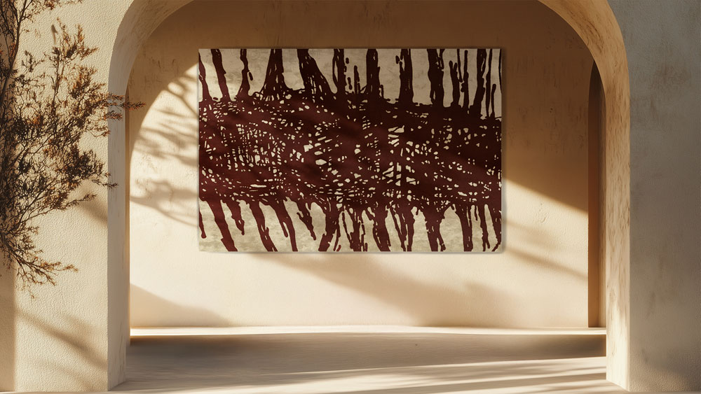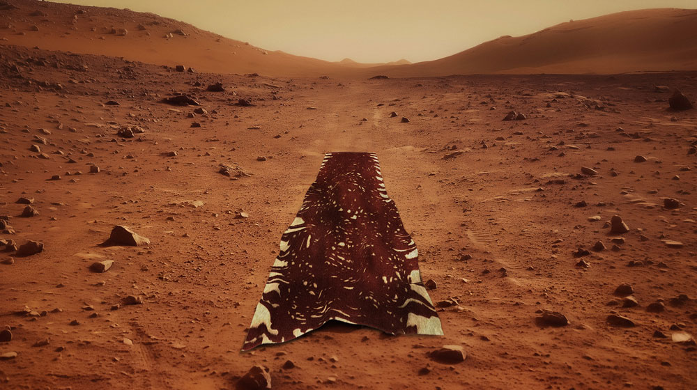 Ispirato al pianeta Marte, il tappeto (e la sua versione runner) interpreta l’idea di paesaggio interiore: forme organiche si fondono a pattern primitivi, quasi a evocare segni rituali o tracce di civiltà scomparse.