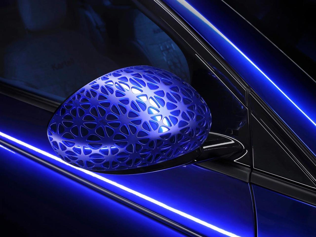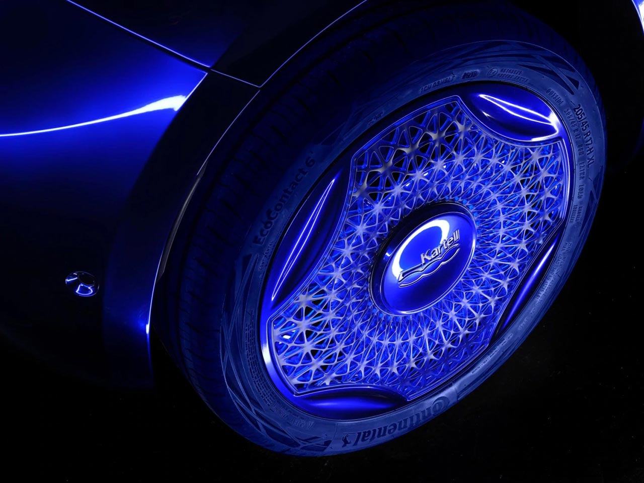 La special edition Full Electric 500 Kartell si ispira all’inconfondibile segno grafico della lampada Kabuki disegnata da Ferruccio Laviani per il brand e ne ripropone la trama in diversi elementi come la plancia, il pattern dei sedili, la griglia frontale, i cerchi e le calotte specchio realizzati in policarbonato riciclato dalle parabole dei proiettori dismessi. Anche il colore dell’auto è un richiamo allo stile Kartell: il blu Kartell derivato dal blu Klein, uno dei colori identitari del marchio che sulla carrozzeria diventa a effetto specchio e mette in risalto i loghi dei due brand.