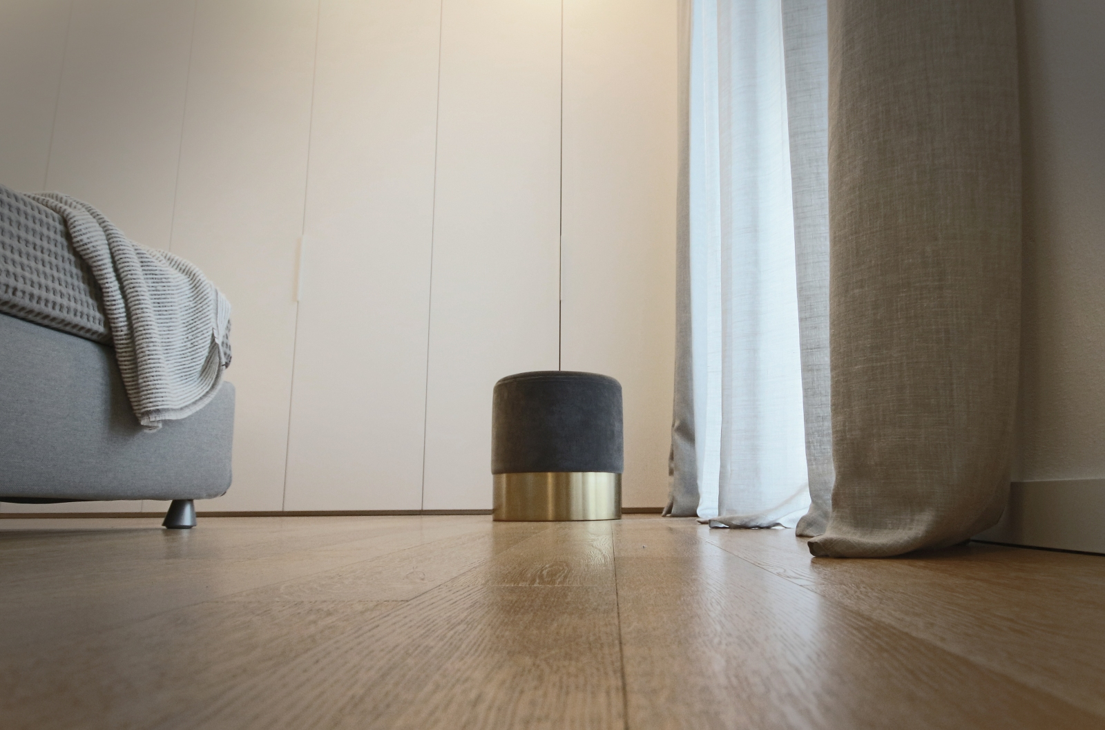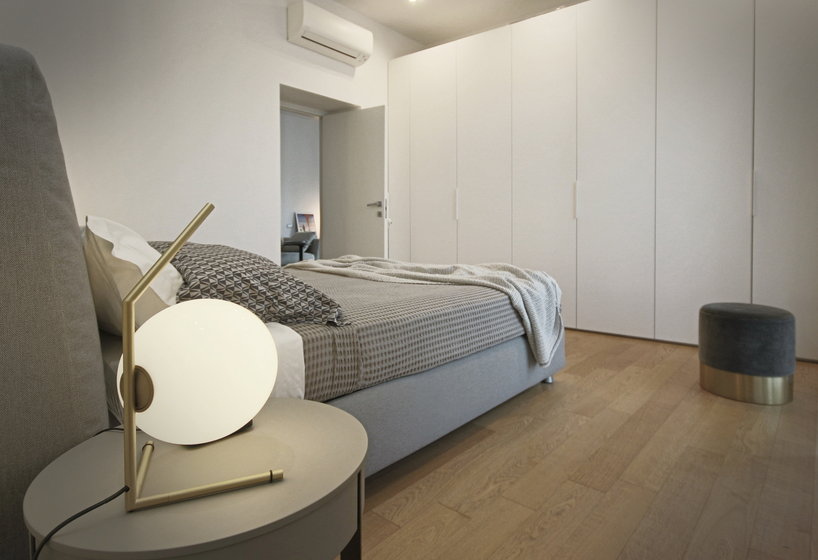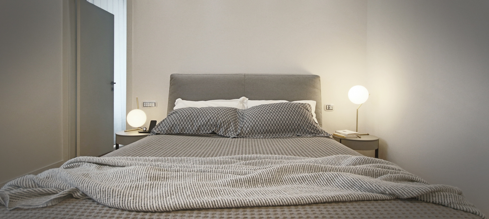 Nella zona notte, il letto in tessuto sfoderabile è il modello My Place di Flou, accompagnato dai comodini Sign di Lema Mobili, design Studio Kairos. Le lampade con struttura in ottone e diffusore in vetro della collezione IC Lights di Flos offrono un’illuminazione raffinata. Un grande armadio laccato con anta battente, realizzato su misura, occupa la parete di fronte al letto, fornendo ampio spazio di archiviazione.