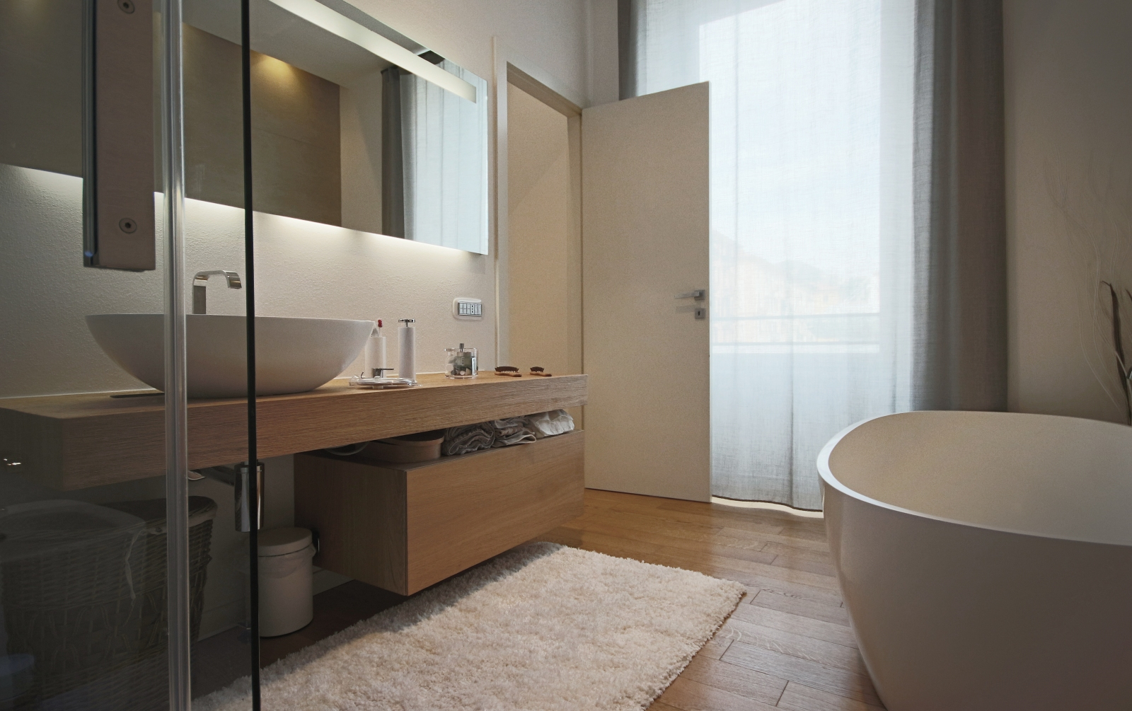Il bagno è arredato con una grande vasca e mobili in rovere naturale, creando un ambiente accogliente e rilassante. Tutte le tende della casa sono state realizzate da Athena Collezioni, aggiungendo un tocco finale di eleganza.