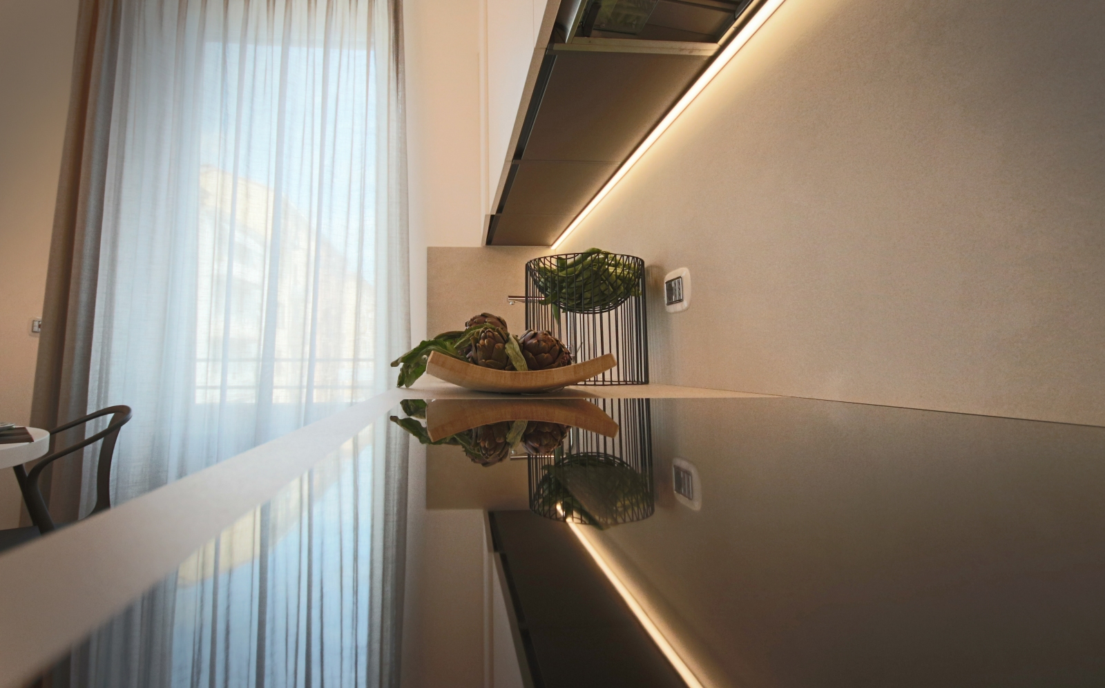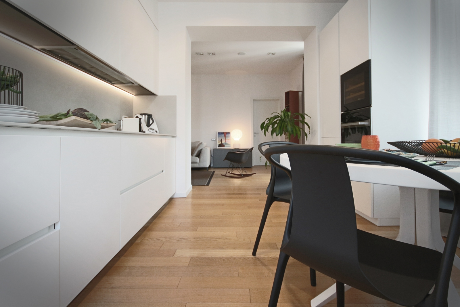 La cucina, dal design essenziale e moderno, è il modello AK_Project di Arrital Kitchen. Questa cucina laccata opaca con gola presenta un top e uno schienale in Laminam con uno spessore di 12 mm, garantendo un aspetto raffinato e resistente. Gli elettrodomestici Miele assicurano efficienza e qualità. Il tavolo rotondo allungabile è il modello Oops di Kristalia, abbinato alle sedie Belleville, disegnate da Ronan & Erwan Bouroullec per Vitra. Sul tavolo, la lampada a sospensione 2097, disegnata da Gino Sarfatti per Flos nel 1958, aggiunge un tocco di eleganza. Gli accessori di Kn Industrie e Serax Belgium completano l’arredamento con stile.