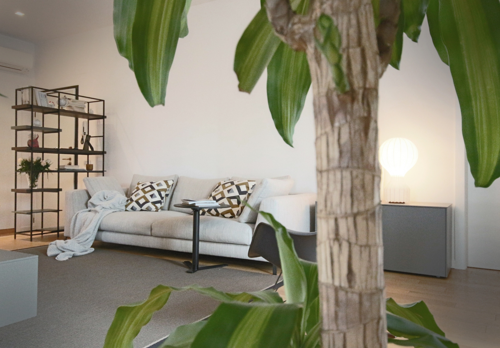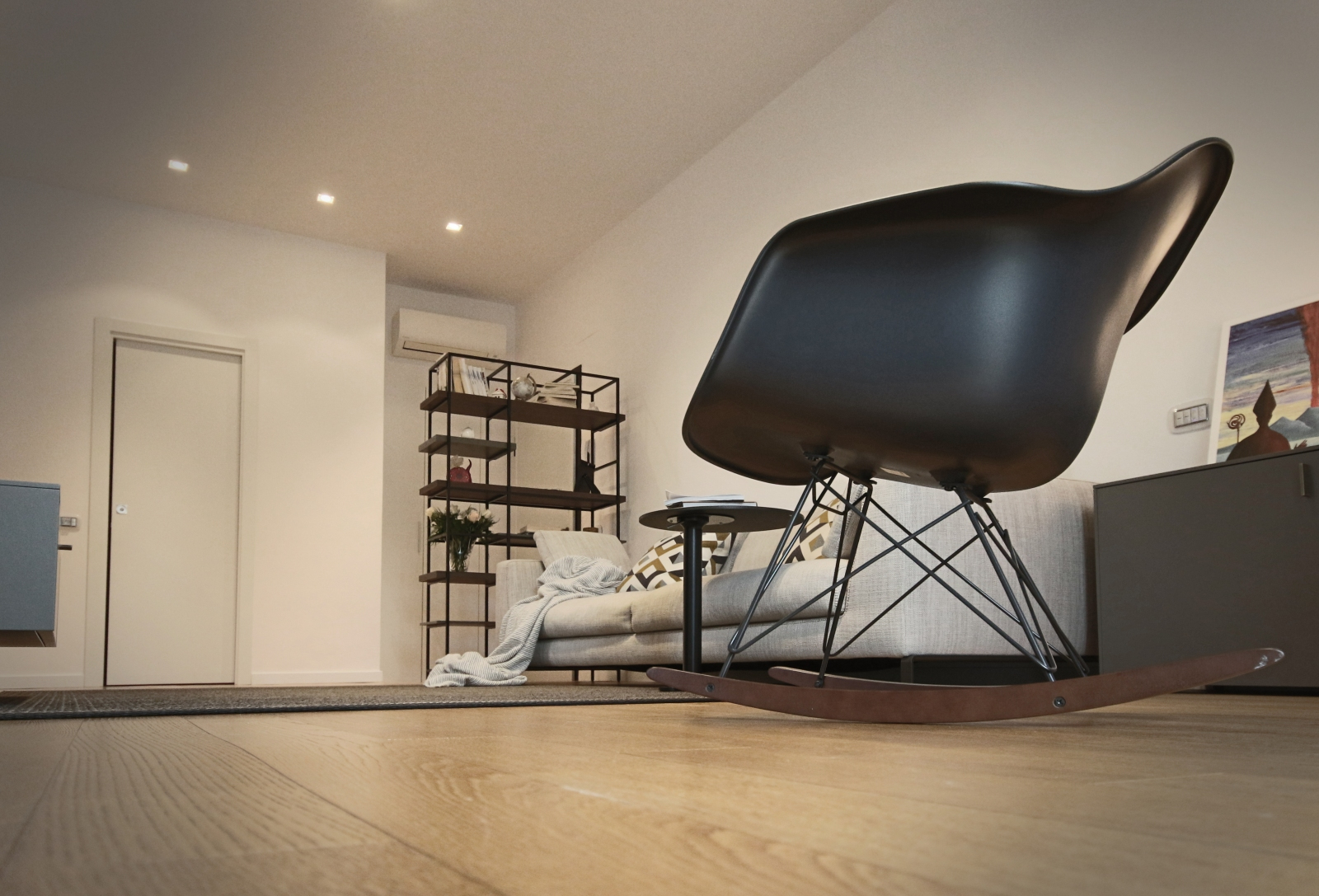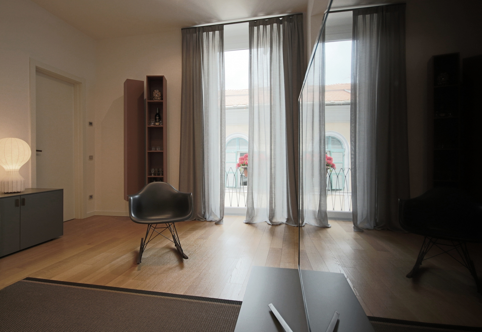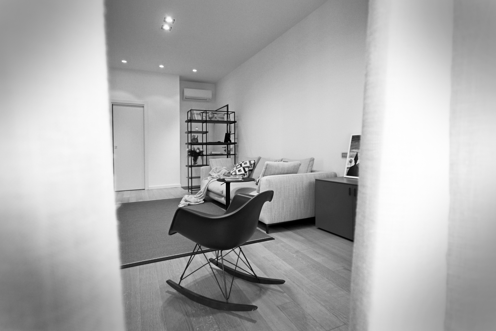 Nella zona living, il mobile TV fa parte del programma T040 di Lema Mobili. Il divano in tessuto Ray di B&B Italia offre comfort e design, mentre il tappeto finlandese di Woodnotes aggiunge calore all’ambiente. Il tavolino di servizio regolabile in altezza modello YO di Lapalma è perfetto per ogni esigenza. La poltroncina a dondolo RAR Eames Plastic Chair, disegnata da Charles & Ray Eames per Vitra nel 1950, è un classico intramontabile. La zona giorno è completata dalla libreria Plain di Lema Mobili, design di Francesco Rota, e dai contenitori verticali a parete Totò, disegnati da Studio Kairos. La lampada da tavolo Gatto, disegnata da Achille & Pier Giacomo Castiglioni nel 1960, con il suo diffusore in resina “cocoon”, è un pezzo iconico.