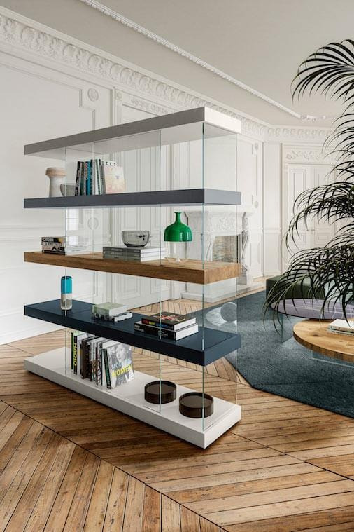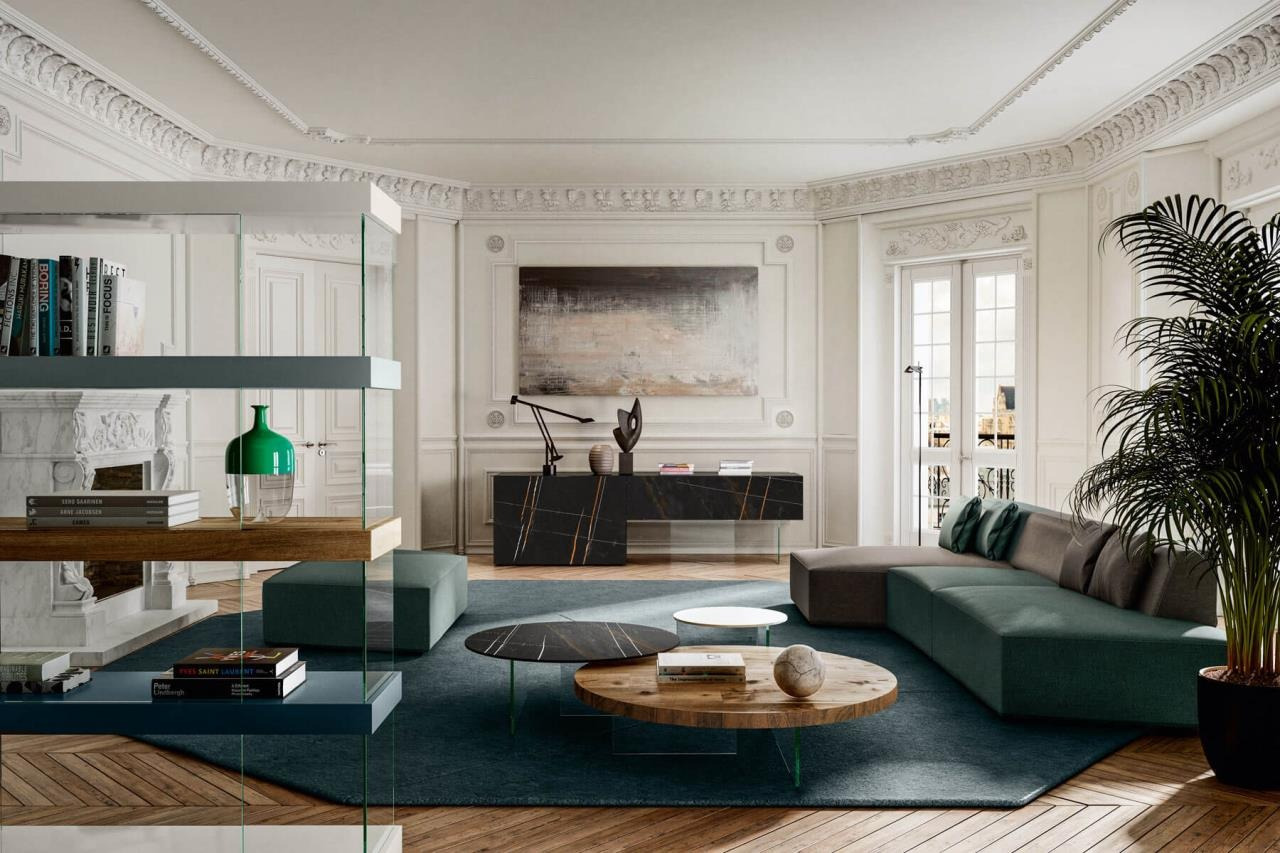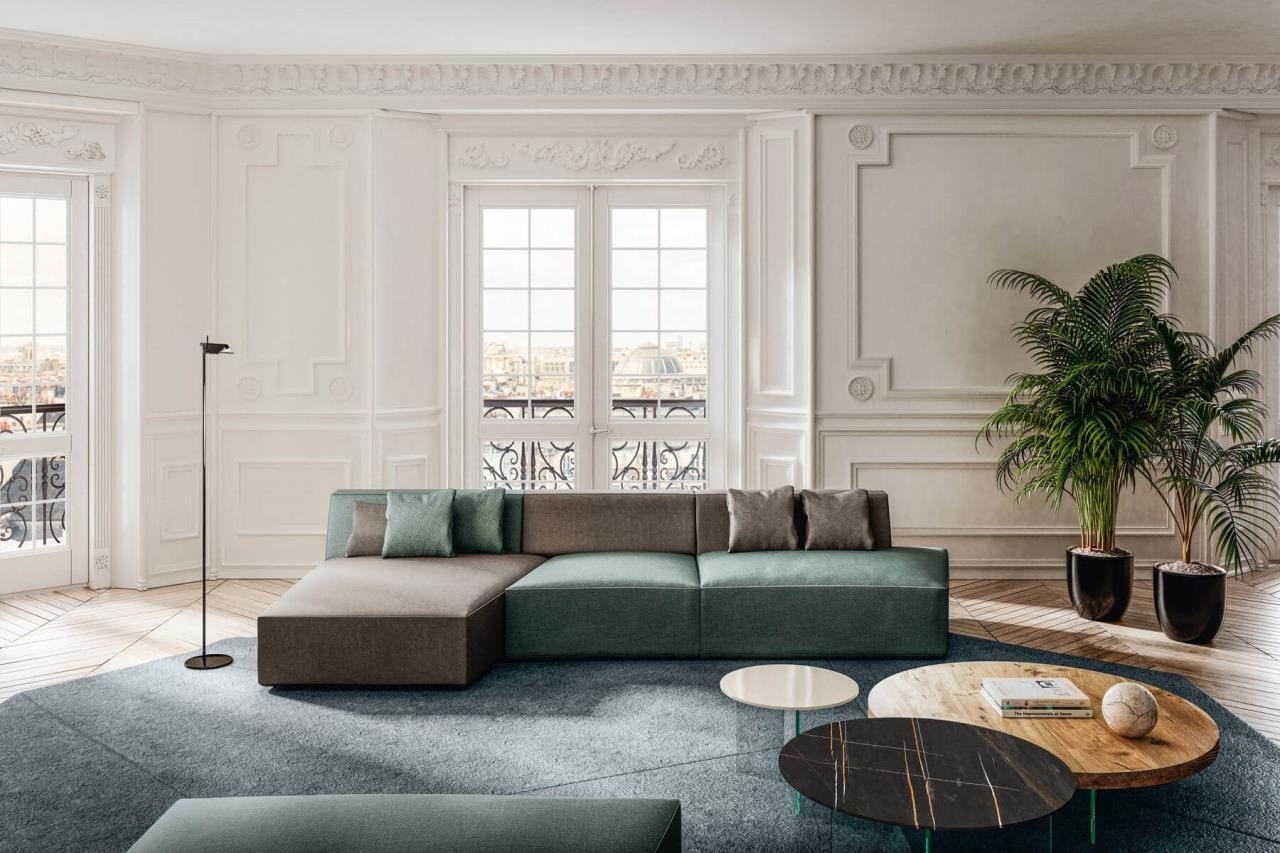 Sul piano nobile di un palazzo ottocentesco parigino si schiude un attico vista Tour Eiffel vestito di emozioni materiche e leggerezza. Il design contemporaneo conferisce allo spazio un’allure elegante propria della Ville Lumière creando un perfetto connubio fra presente e passato. Ogni stanza della casa è espressione della riuscita fusione fra la modernità degli arredi e la storicità di una struttura senza tempo. Gli stucchi decorativi del soffitto e del caminetto ad esempio incontrano le linee geometriche del divano Slide, che grazie alla sua modularità permette una grande espressione compositiva.