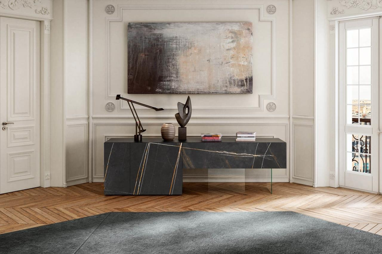 Il soggiorno si sviluppa attorno alla libreria Air, che ne divide gli spazi e fa filtrare la luce proveniente dalle ampie vetrate. Sulla parete opposta invece la madia 36e8 XGlass, con il suo aspetto monolitico dai tratti marmorei, si impone elegantemente emulando una piccola architettura da salotto.