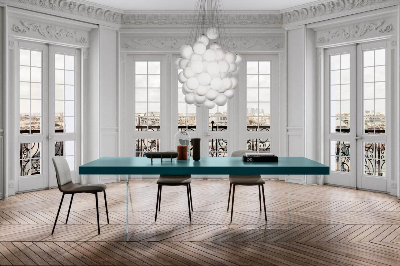 Muovendosi verso la sala da pranzo, il protagonista diventa il tavolo Air, che grazie alla sua risolutezza e alle sue note ottanio, cattura lo sguardo e il pensiero di chi vive nella casa. Il filo conduttore della leggerezza prosegue anche nella camera da letto, che ruota attorno al letto Air ed alle sue gambe in vetro temperato.