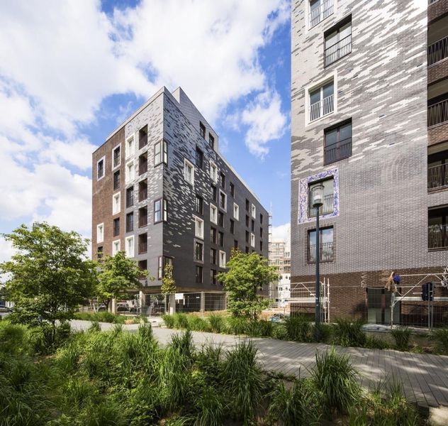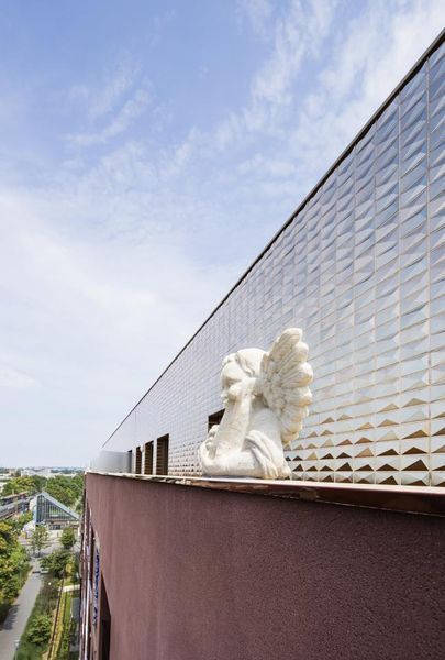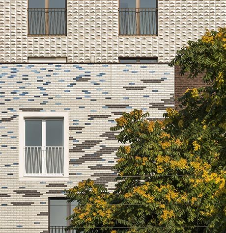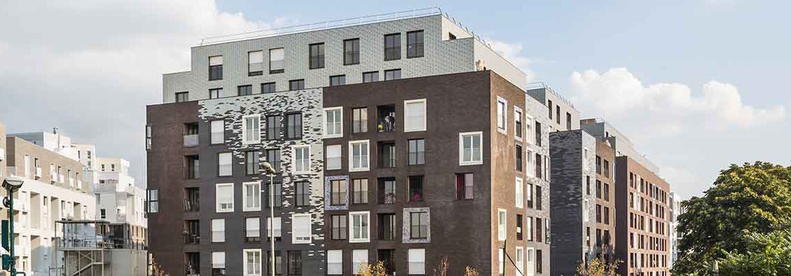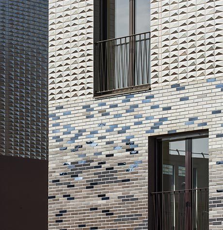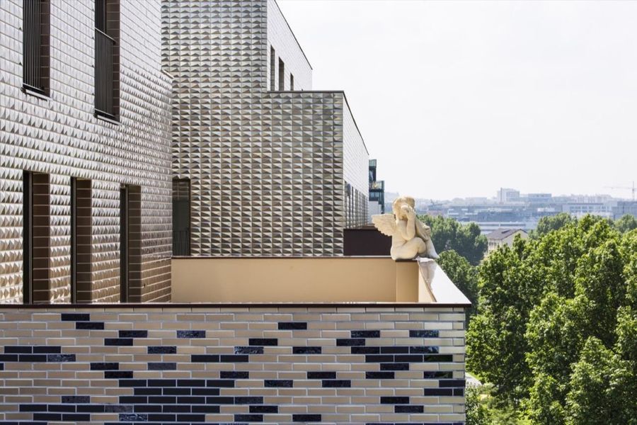 Nel complesso residenziale ad Asniéres-sur-Seine il rivestimento ceramico nella sua particolare soluzione produttiva tridimensionale a diamante, segna le sommità degli edifici cambiando in funzione della luce, adattando i suoi colori in base alle stagioni e alle ore del giorno.