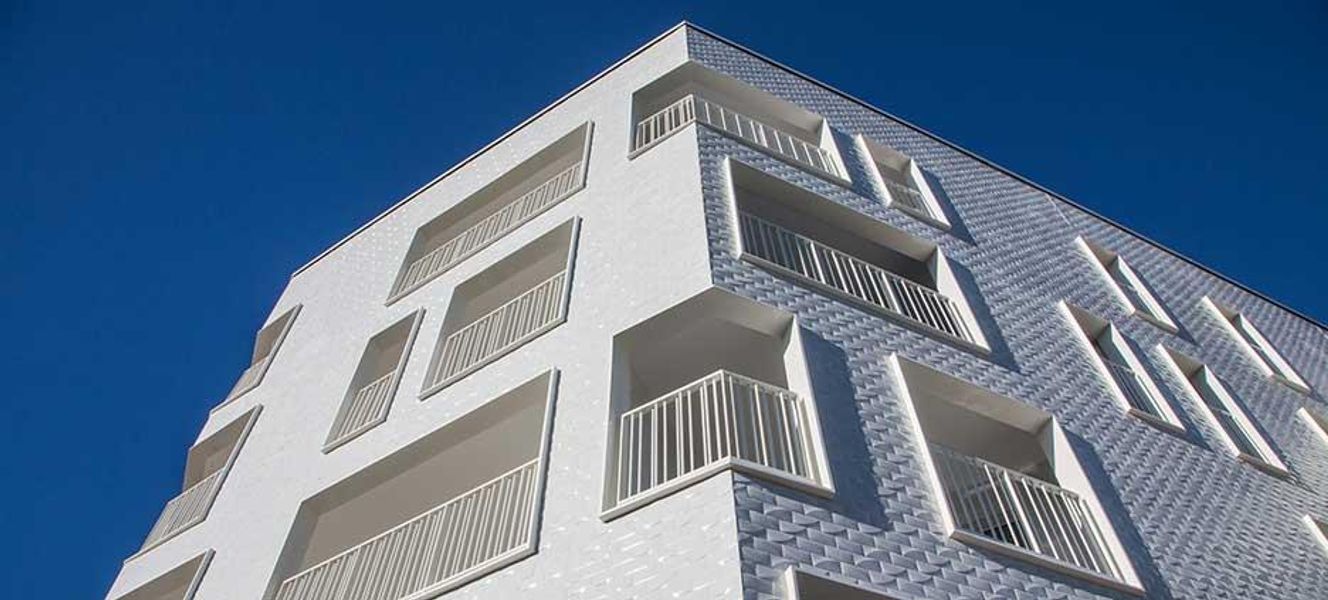 Il disegno della piastrella in gres porcellanato che riveste le facciate, una piccola onda tridimensionale che sembra emergere dal mare riflettendo i raggi del sole, rende cangiante il rivestimento del fronte nord dell’edificio e richiama alla mente le bianche architetture affacciate sul Mediterraneo.