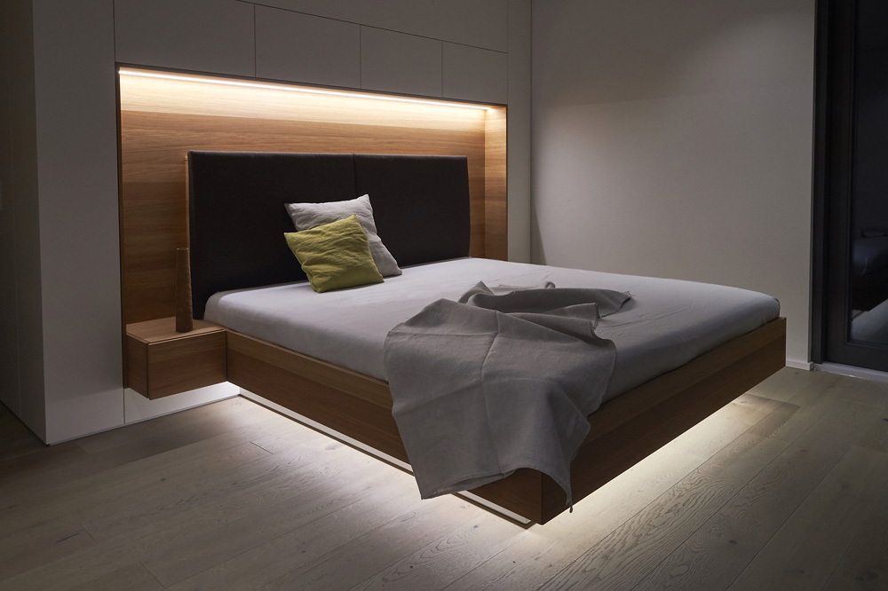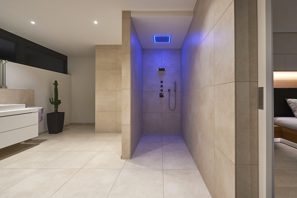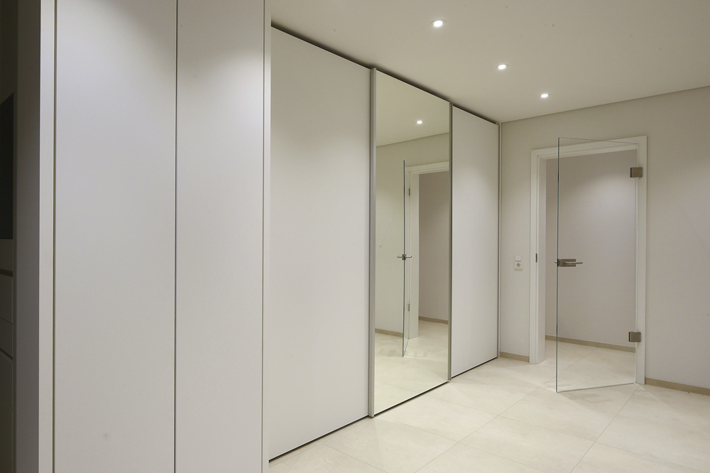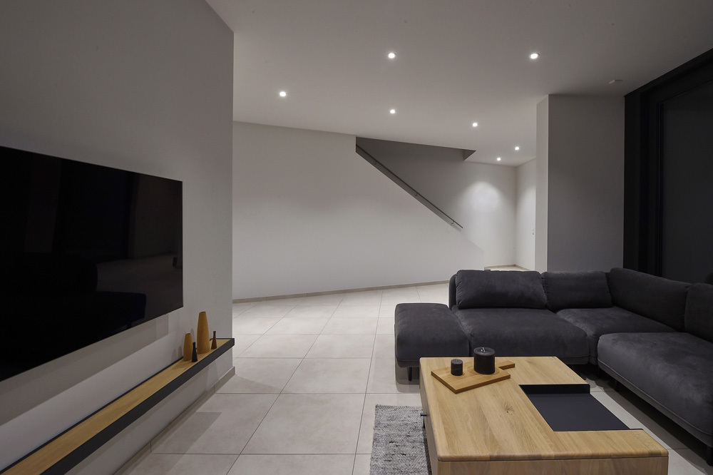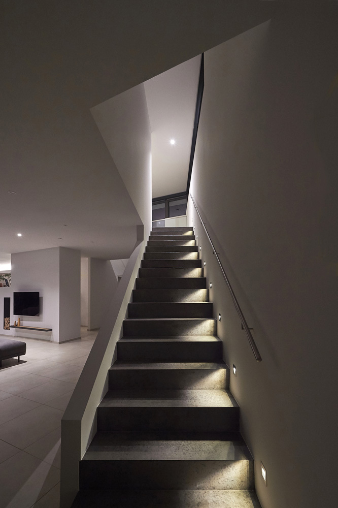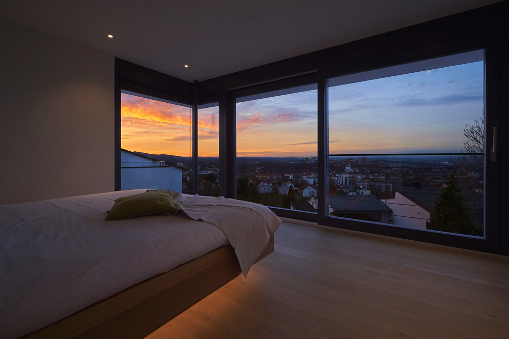 Collocato su terreno in forte pendenza e in posizione più alta rispetto alla città di Reutlingen, l’edificio progettato dall’architetto Thomas Bamberg – Bamberg Architetur è stato strutturato su più livelli: un piano seminterrato con ingresso indipendente dove sono presenti le sale di lavoro per le videoconferenze, un’ampia zona ospiti con bagno e un capiente armadio a muro con ante scorrevoli che oltre ad ospitare il guardaroba, funge anche da spazio di contenimento.